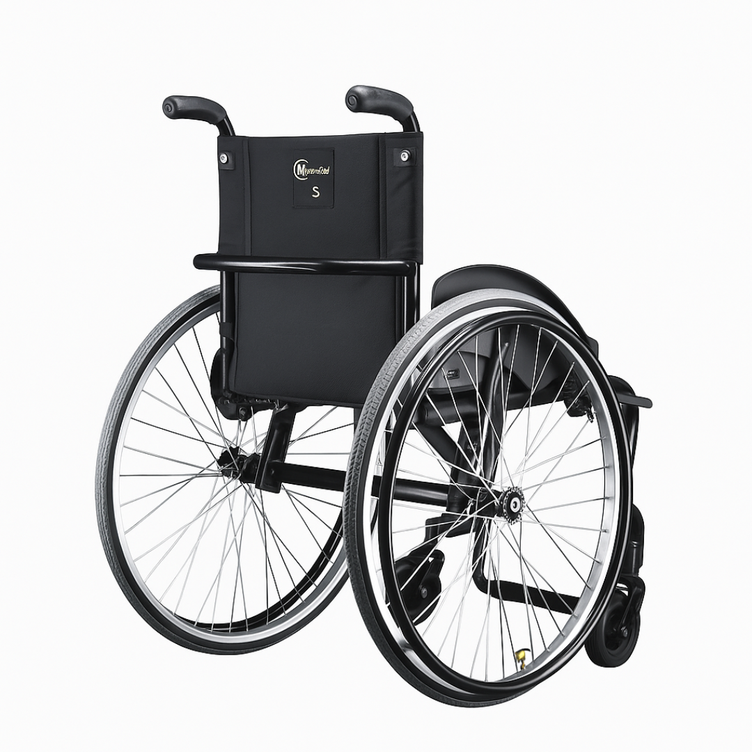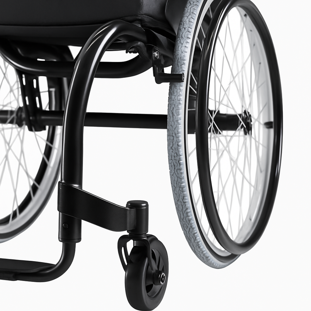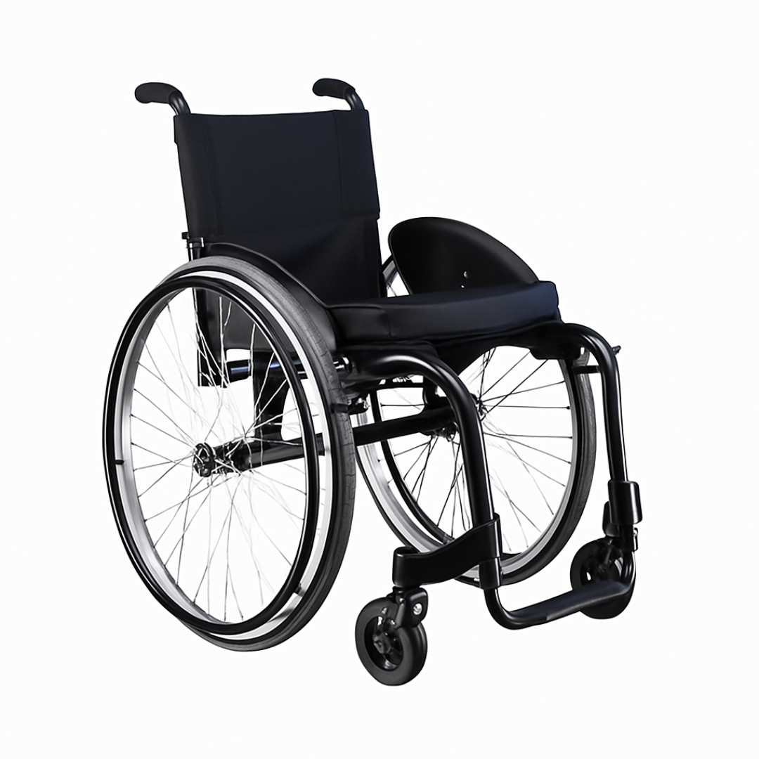 Cadeira de uso ativo monobloco em alumínio T6, com encosto dobrável, centro de gravidade ajustável e rodas traseiras 24” com eixo quick-release. Projeto ultraleve para agilidade e performance no dia a dia.