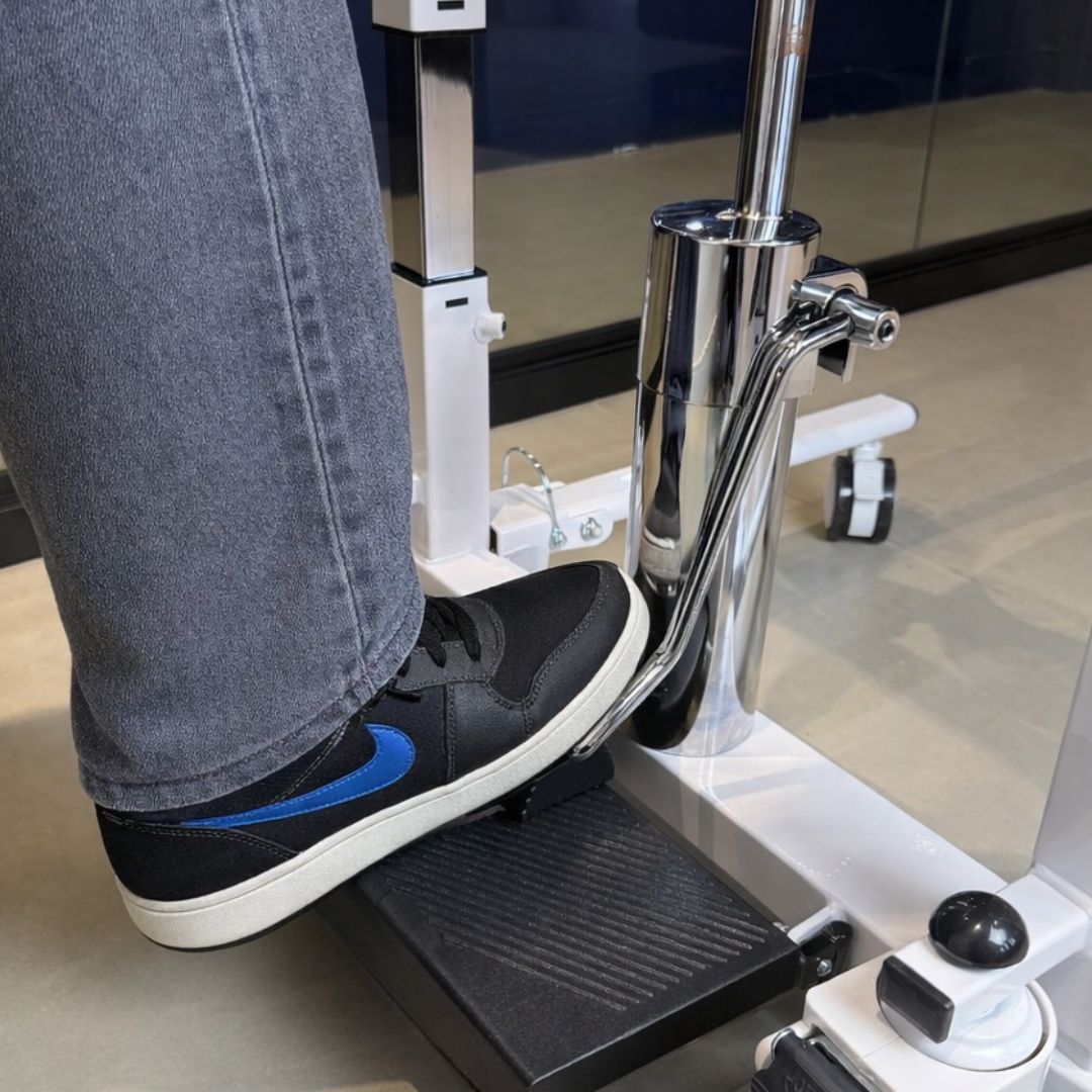 O sistema hidráulico por pedal permite ajuste gradual e controlado da altura do assento.