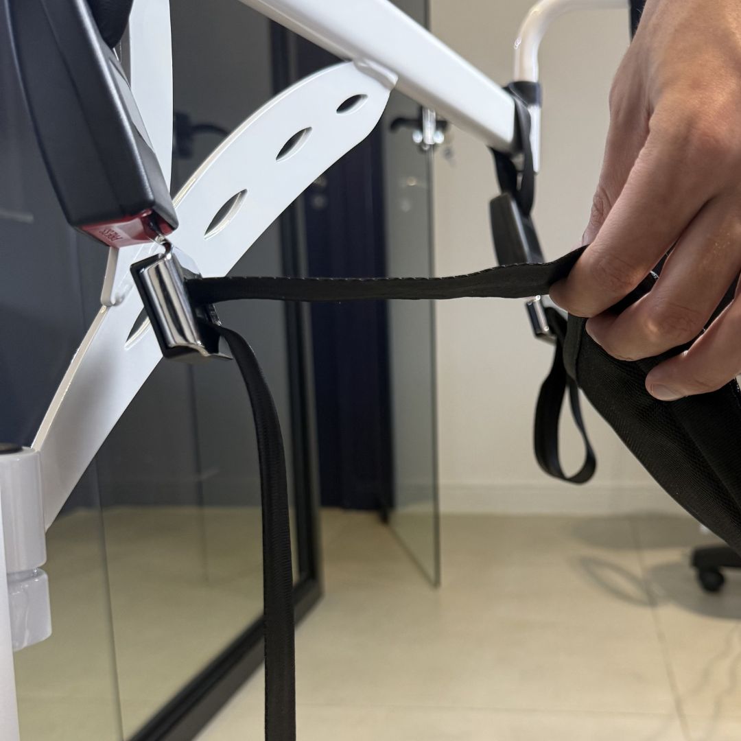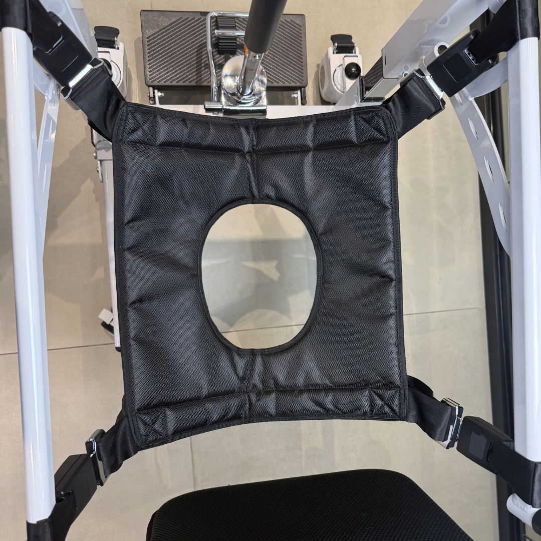 Encosto com cinto ajustável, apoios laterais e plataforma para os pés ajudam a manter o usuário bem posicionado.