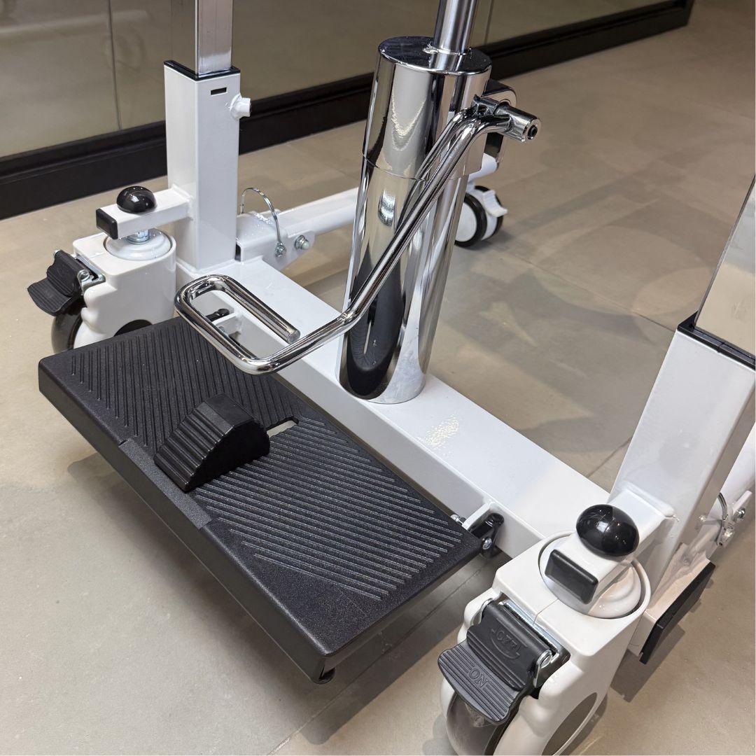 Estrutura em aço carbono com pintura epóxi, sistema de elevação hidráulica por pedal e rodízios com travas. Mais praticidade, conforto e segurança na transferência de pessoas com mobilidade reduzida para dentro e fora do carro.