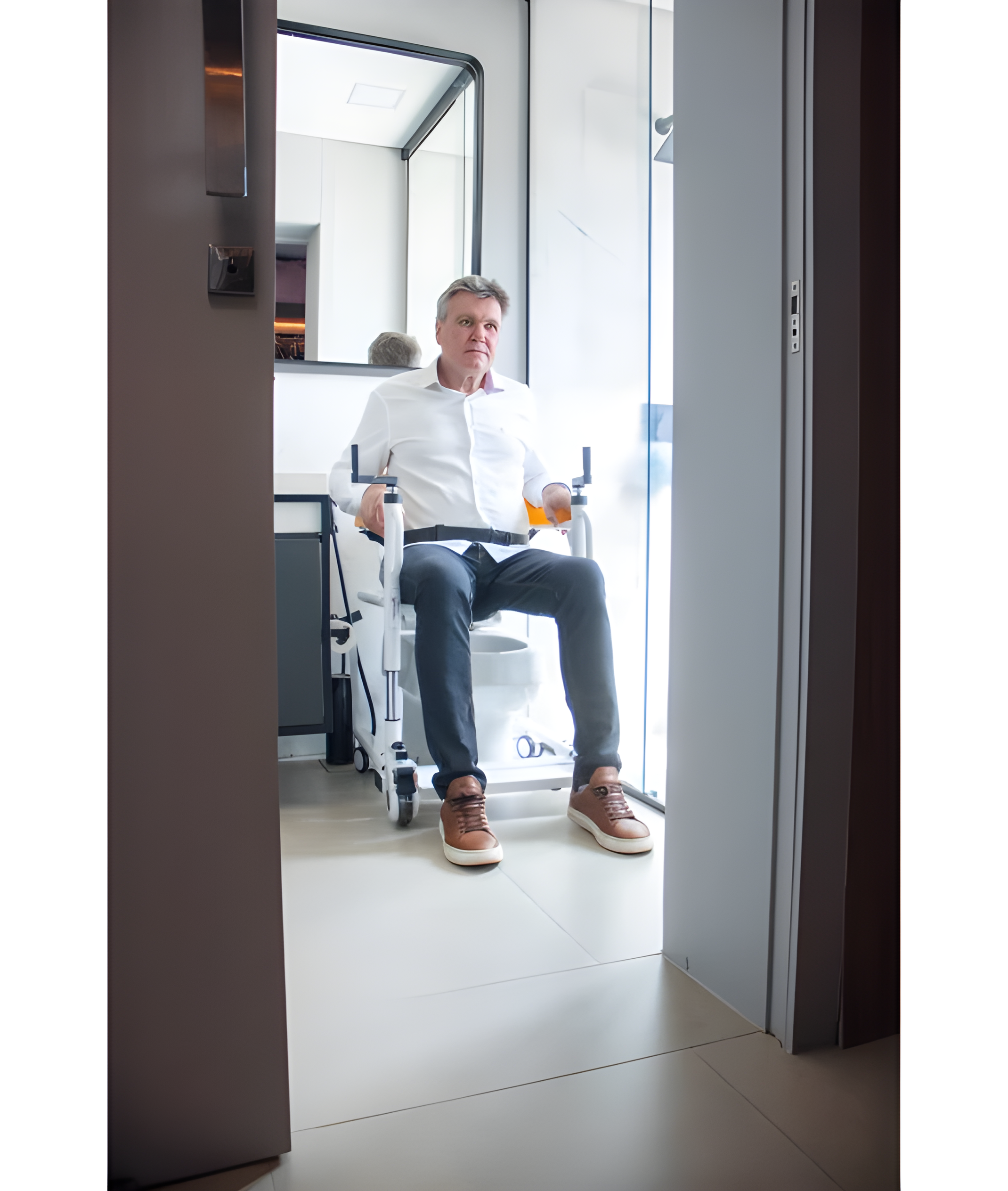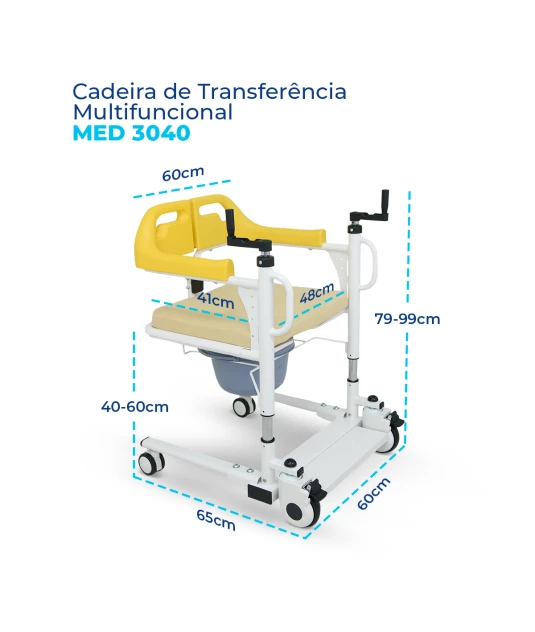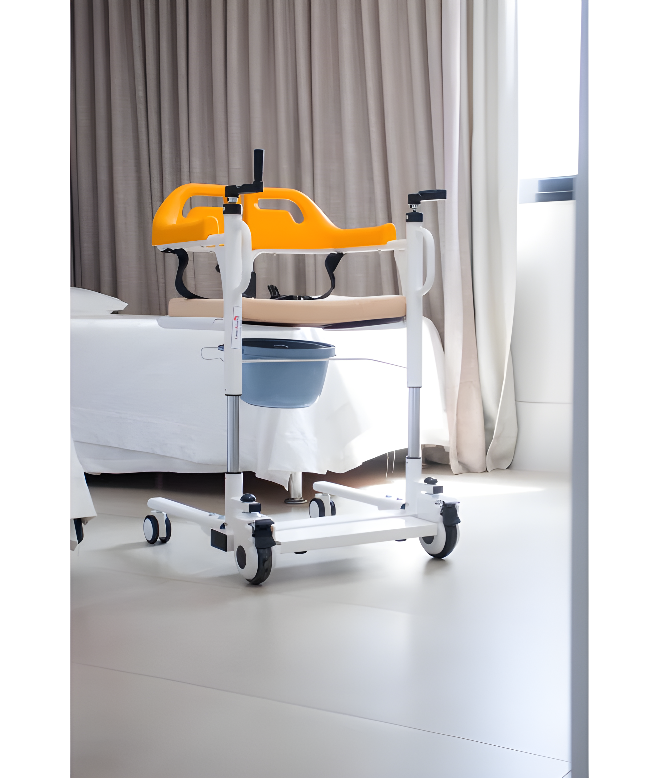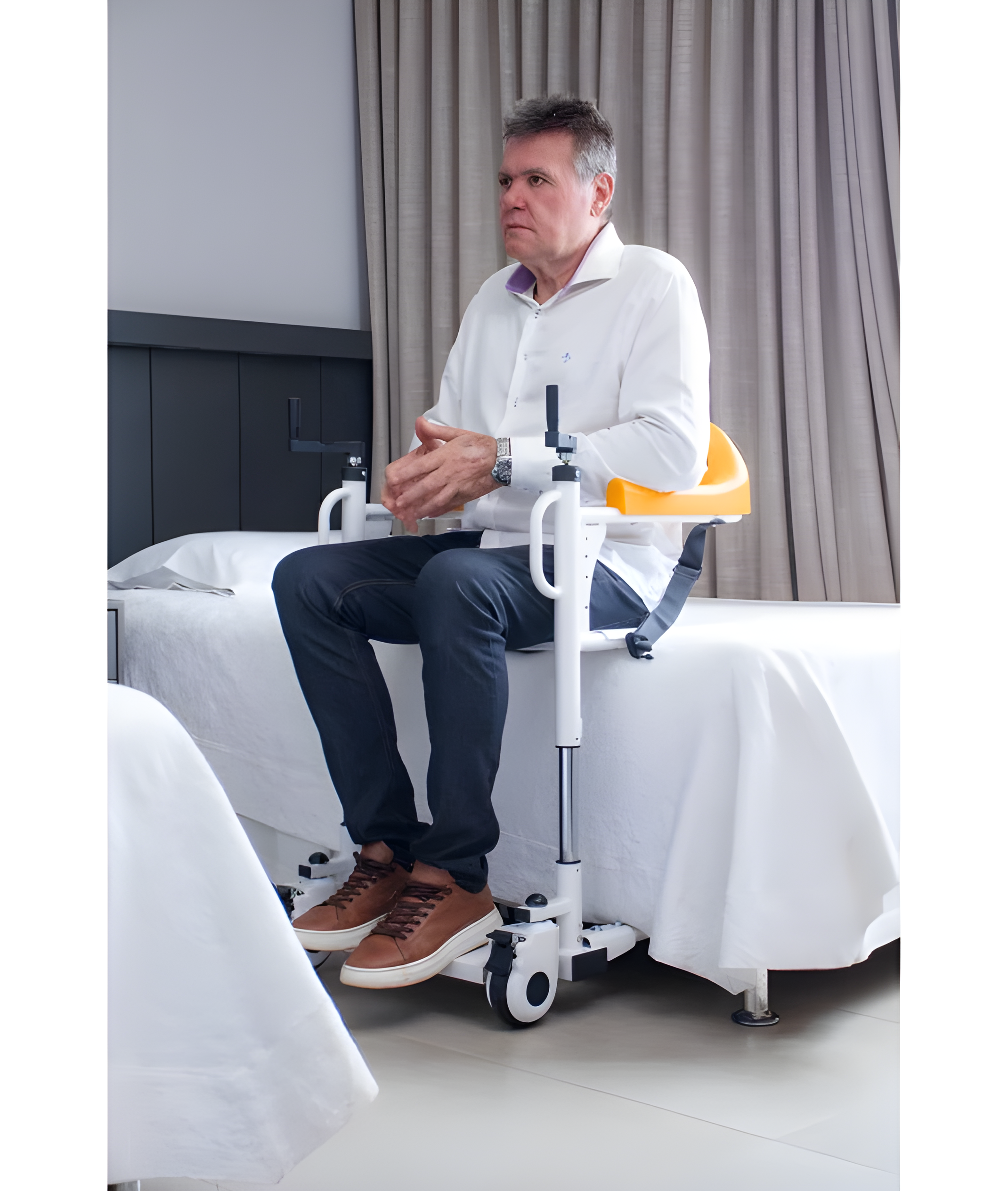 Uma solução 4 em 1 (transferência, transporte, banho e uso sobre vaso) que facilita a rotina do cuidador e do usuário. Estrutura robusta, componentes duráveis e regulagens práticas garantem segurança e conforto durante as movimentações.