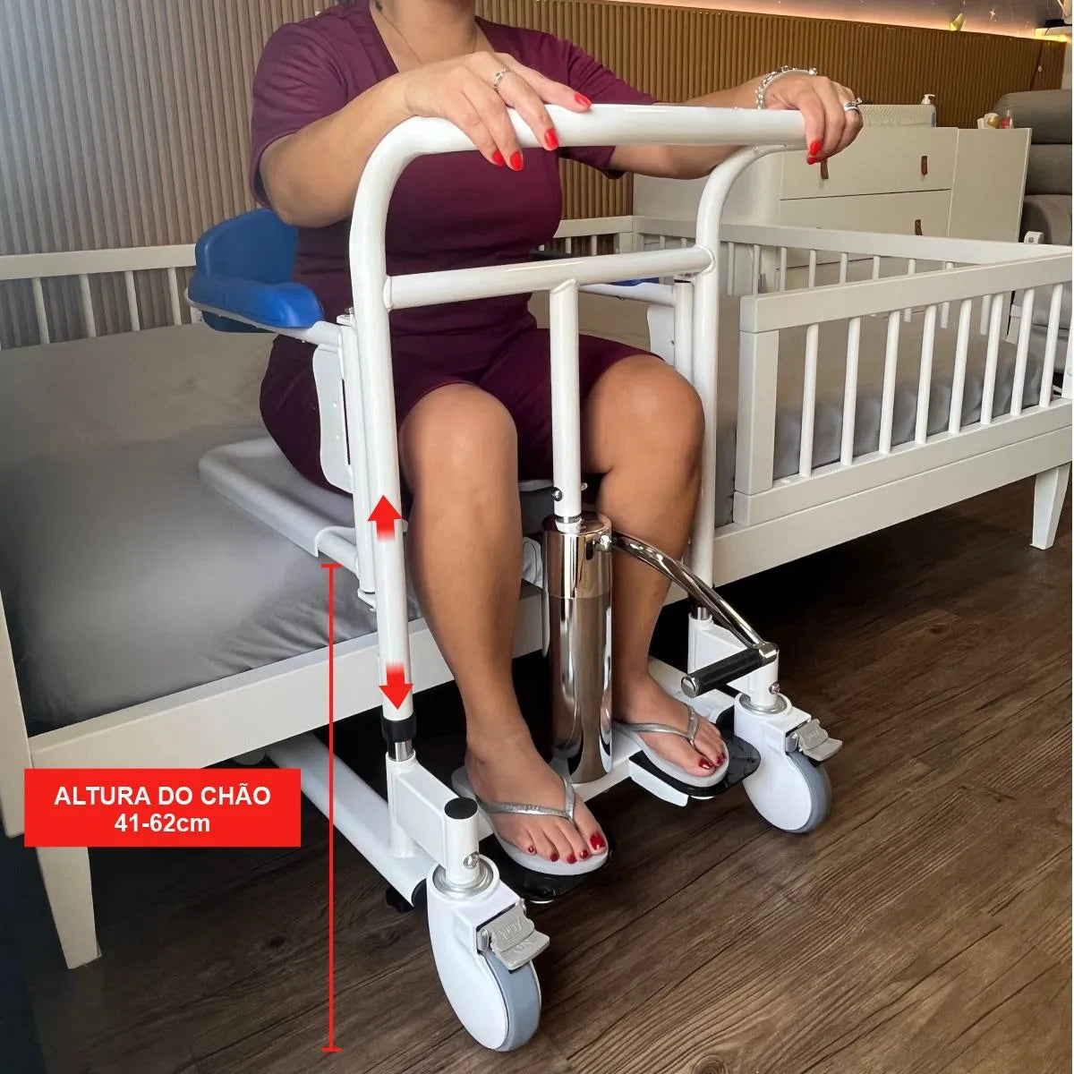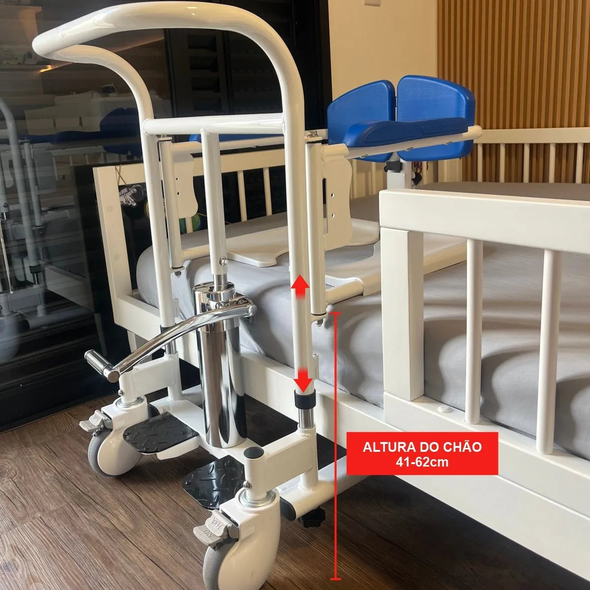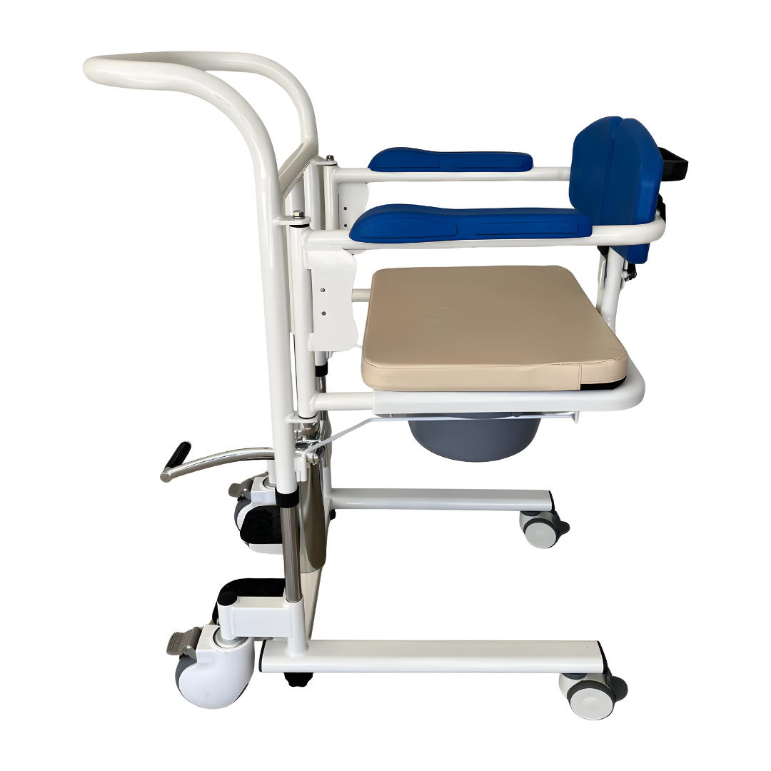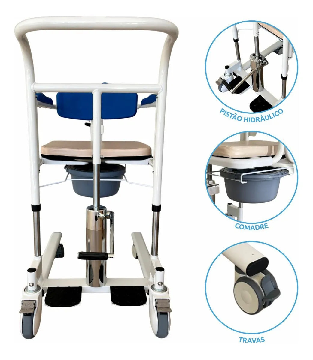 Cadeira de apoio e transferência com elevação hidráulica, assento impermeável e comadre integrada. Estrutura robusta com pintura epóxi, rodas de 3" com travas e capacidade até 135 kg para transporte seguro do usuário.