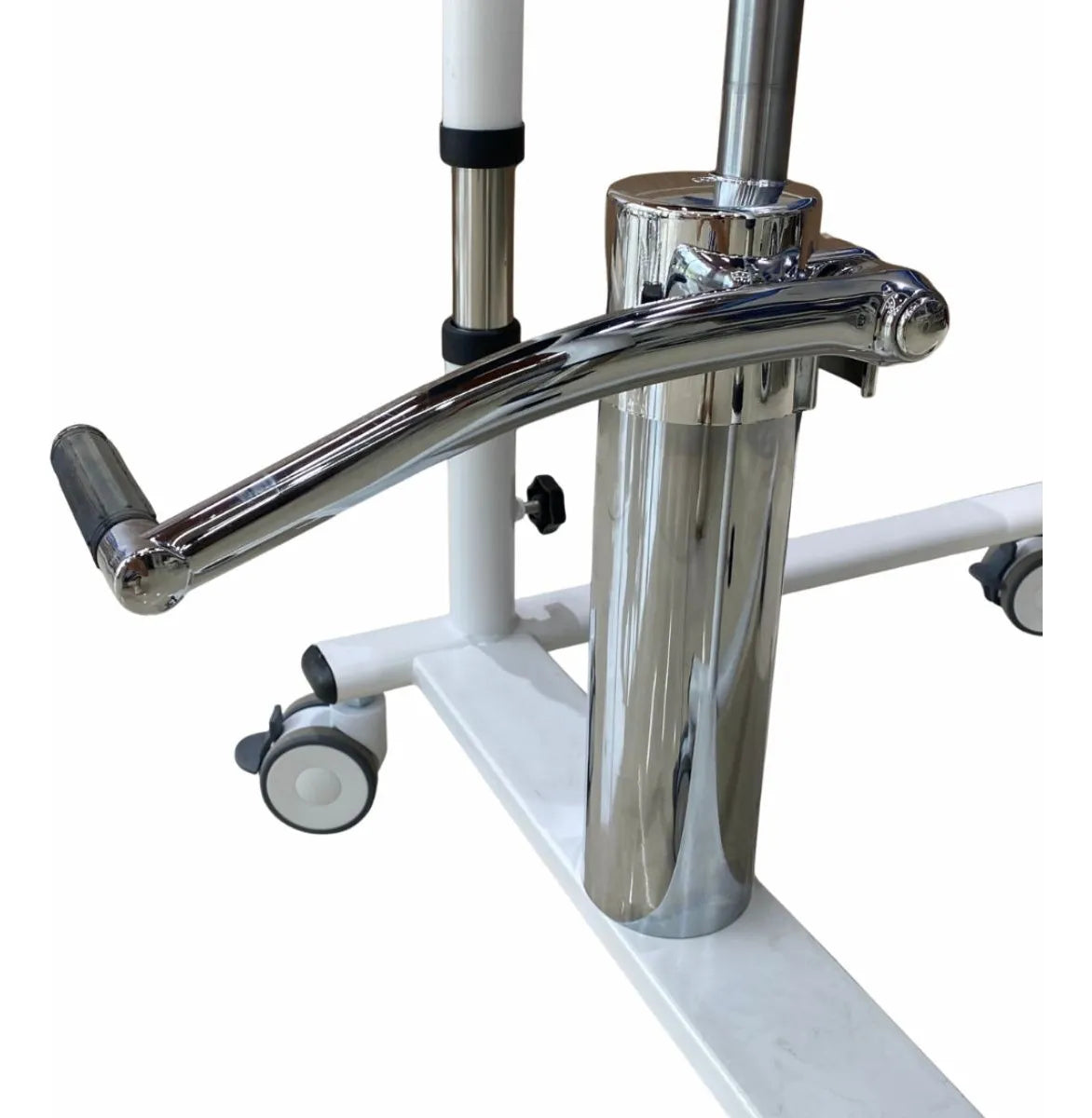 Cadeira de transferência hidráulica, com assento regulável em altura, rodízios com travas e coletor higiênico removível. Estrutura robusta com almofada impermeável para conforto e segurança do usuário. Acompanha mesa de atividades.