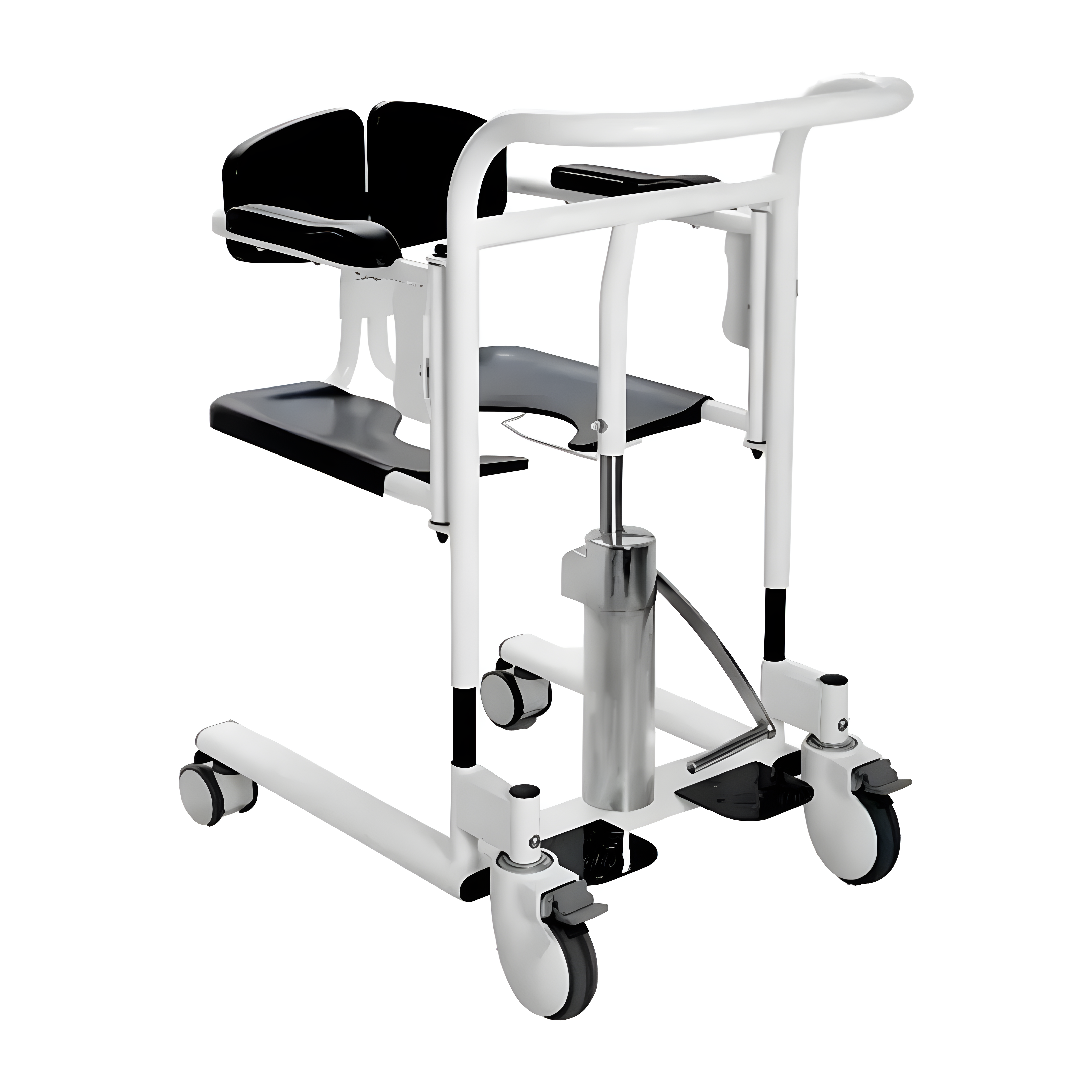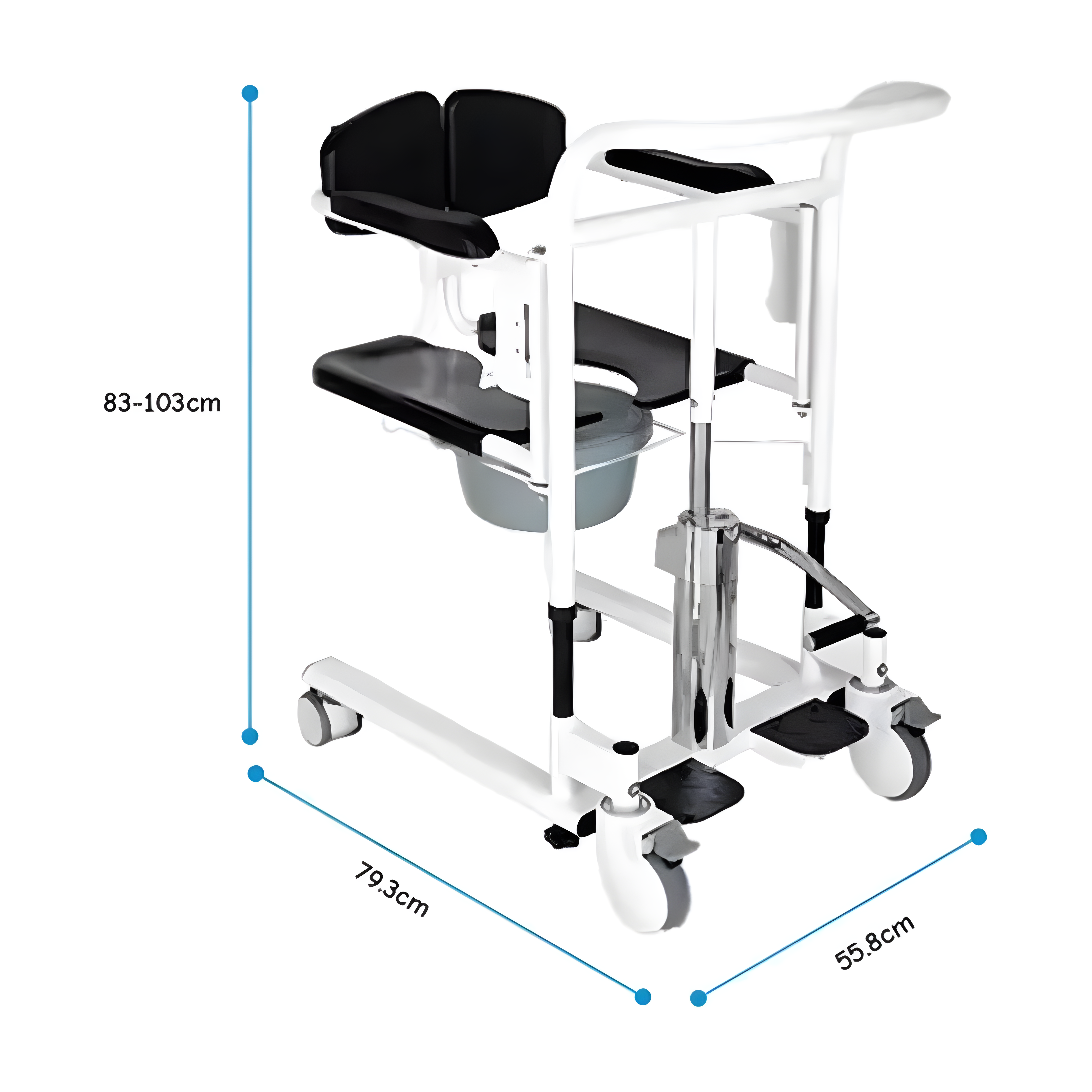 Cadeira 4 em 1 para transferência, higiene, transporte interno e uso sobre o vaso. Estrutura em aço, coletor removível e assento com altura regulável para conforto e segurança em lares, clínicas e hospitais.