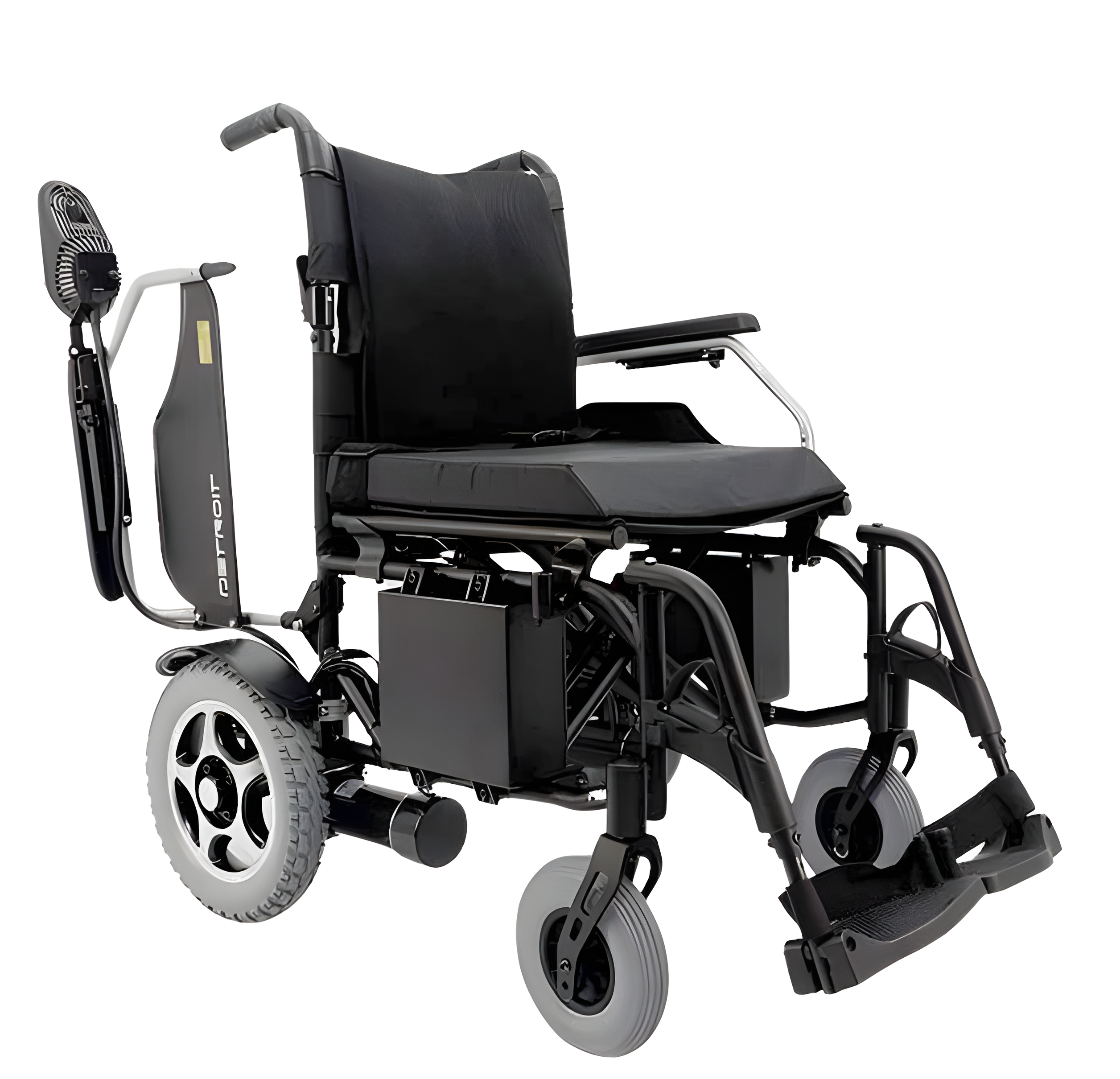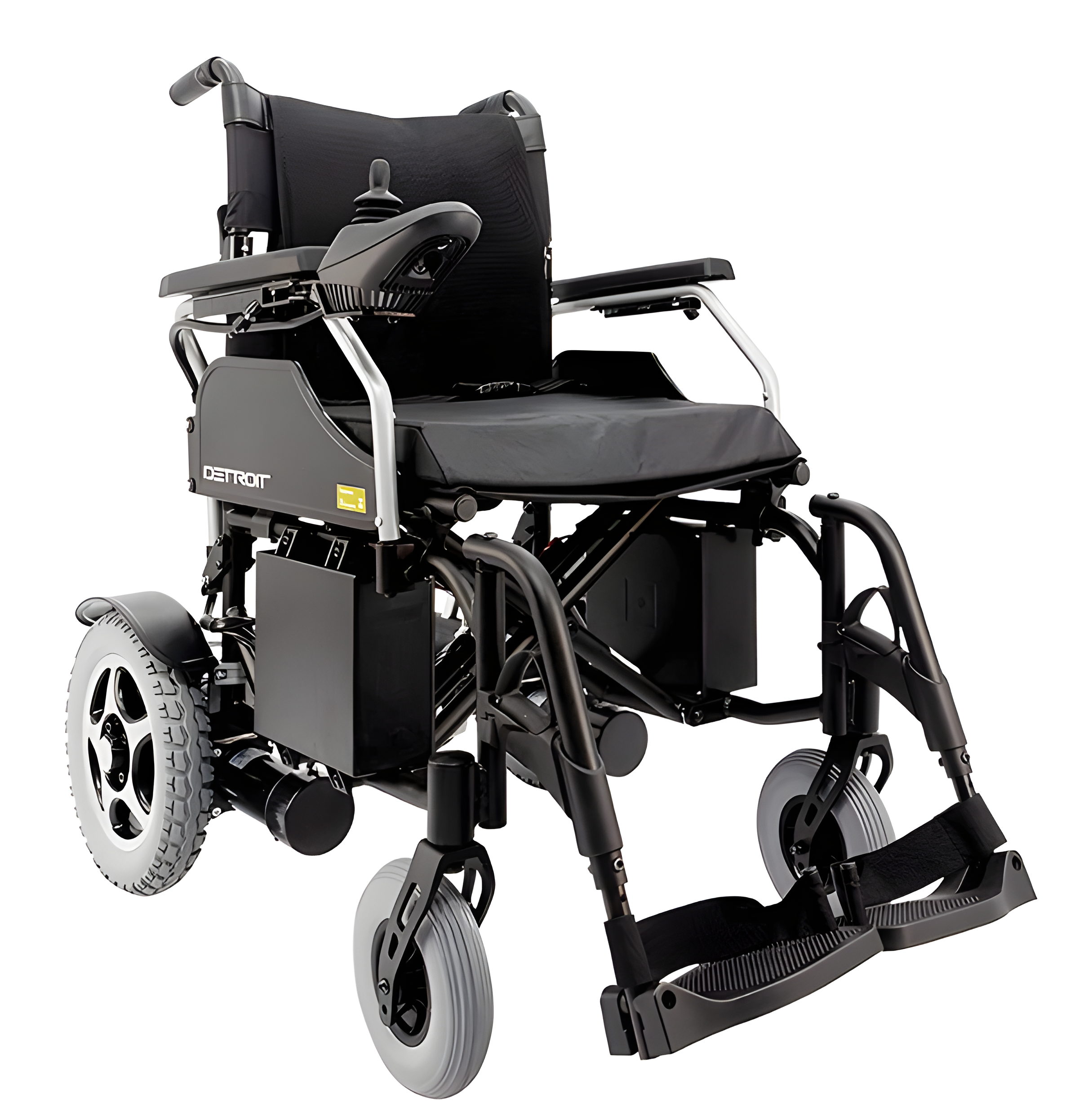 A Detroit é uma cadeira de rodas motorizada em alumínio, com 2 motores traseiros de 200 W, baterias seladas de gel (VRLA 24 V) e estrutura dobrável. Foi projetada para oferecer autonomia, praticidade e condução suave com joystick proporcional.