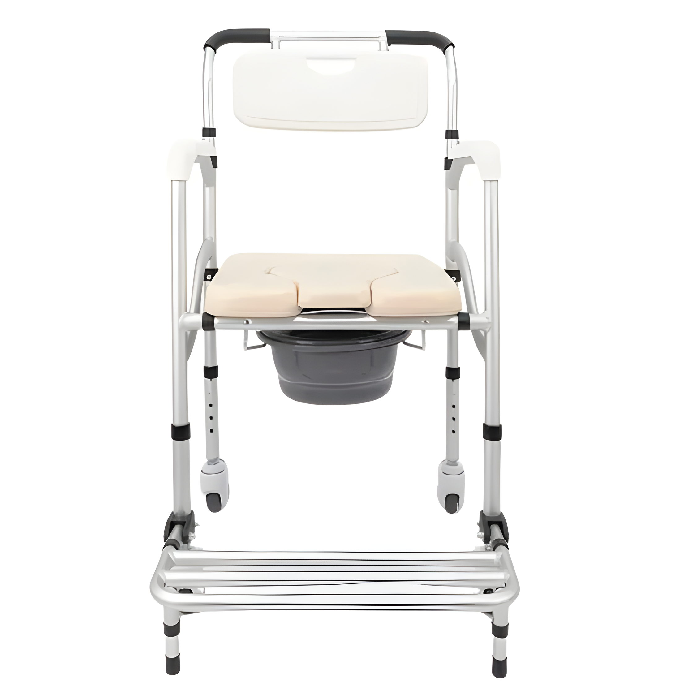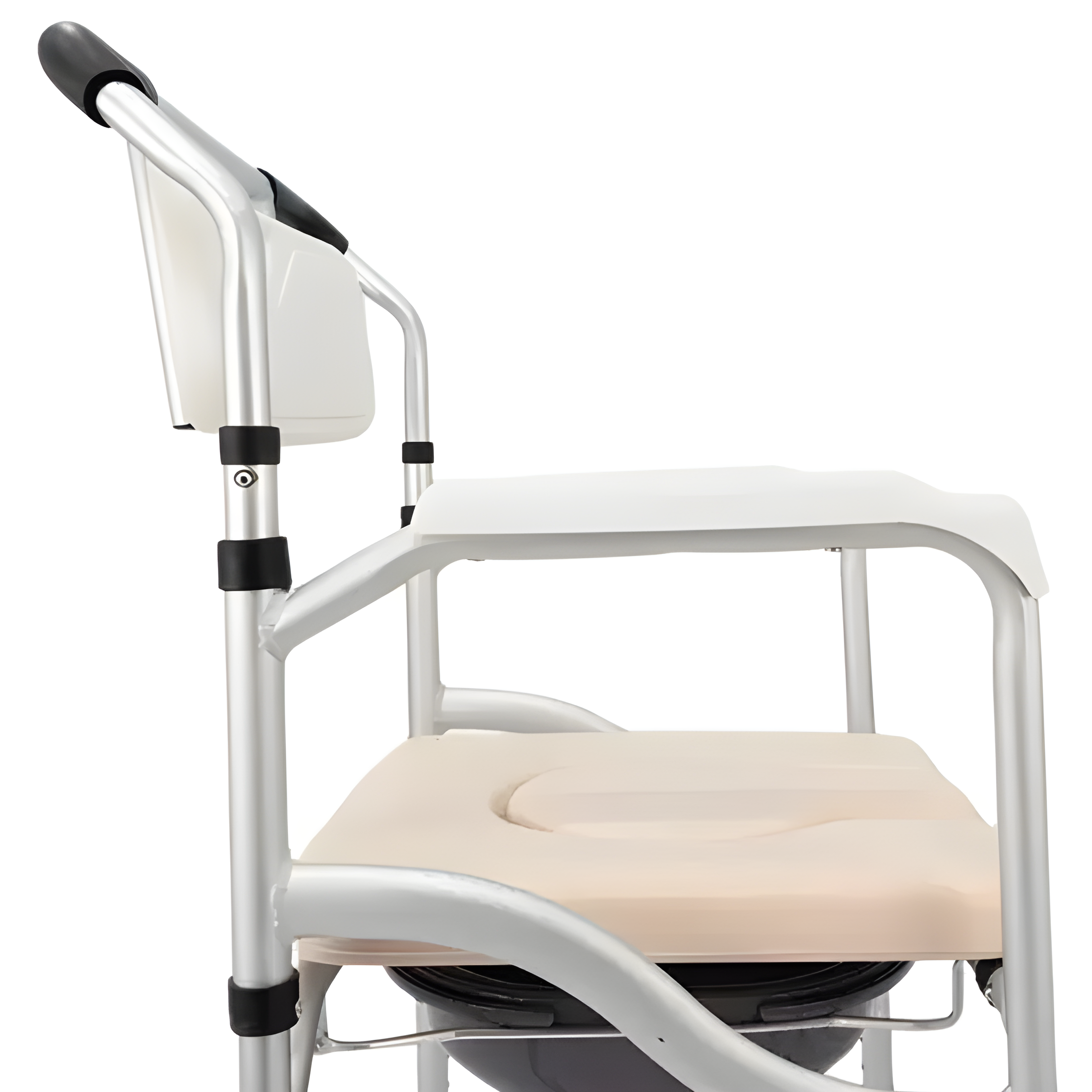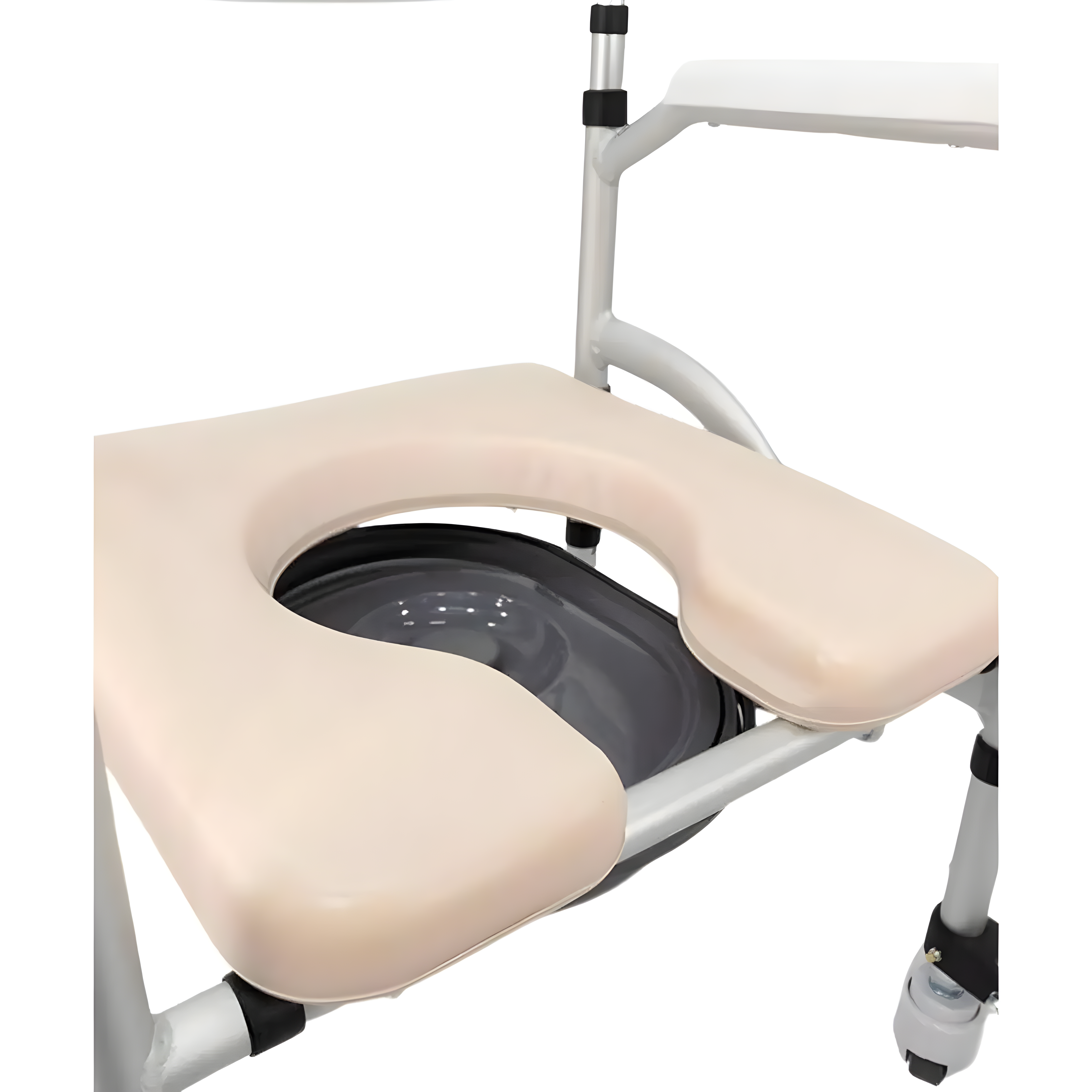 Estrutura em alumínio resistente à oxidação, dobrável, com assento almofadado (abertura frontal), coletor com tampa e rodízios giratórios (traseiros com freio). Conforto e segurança para o banho e a rotina de higiene.