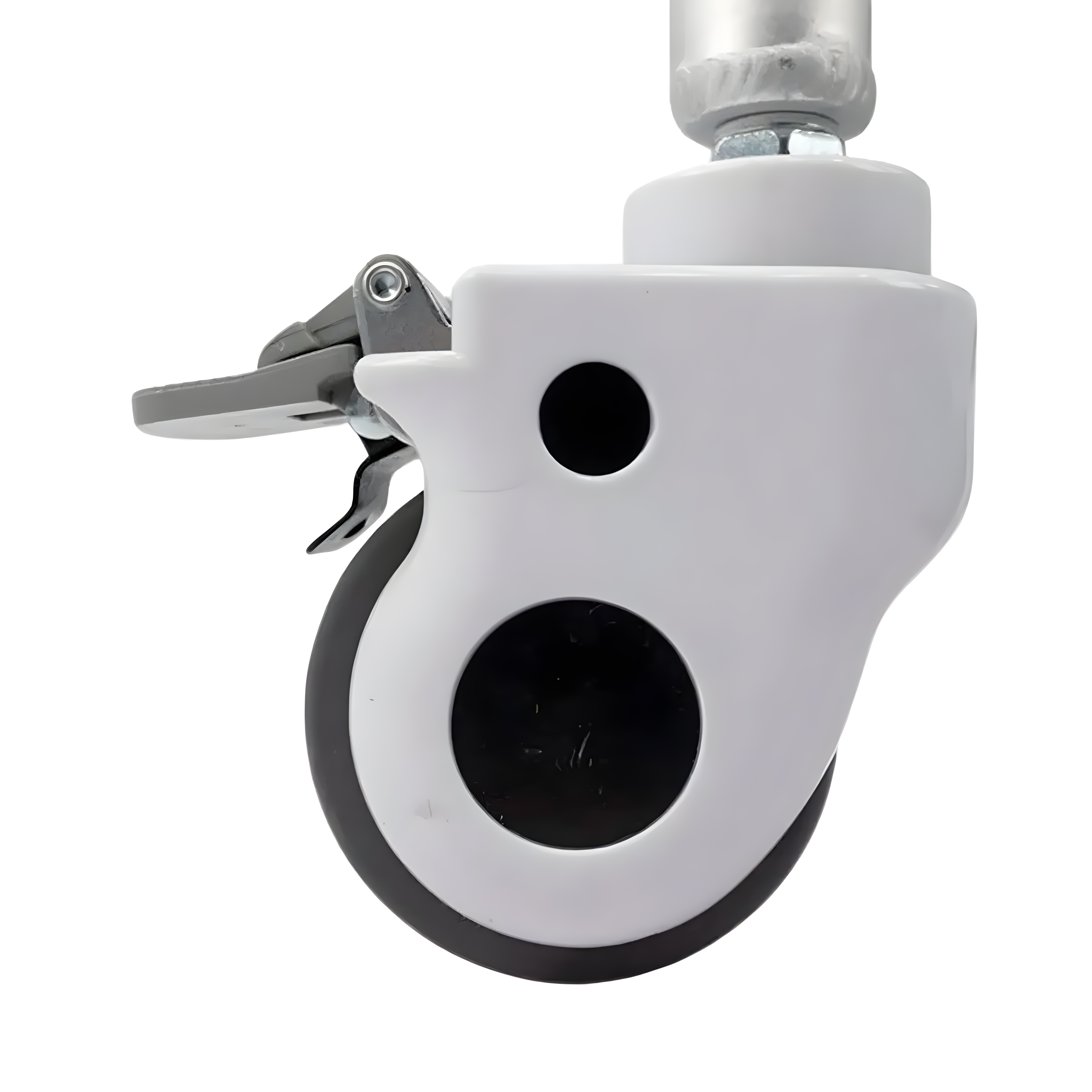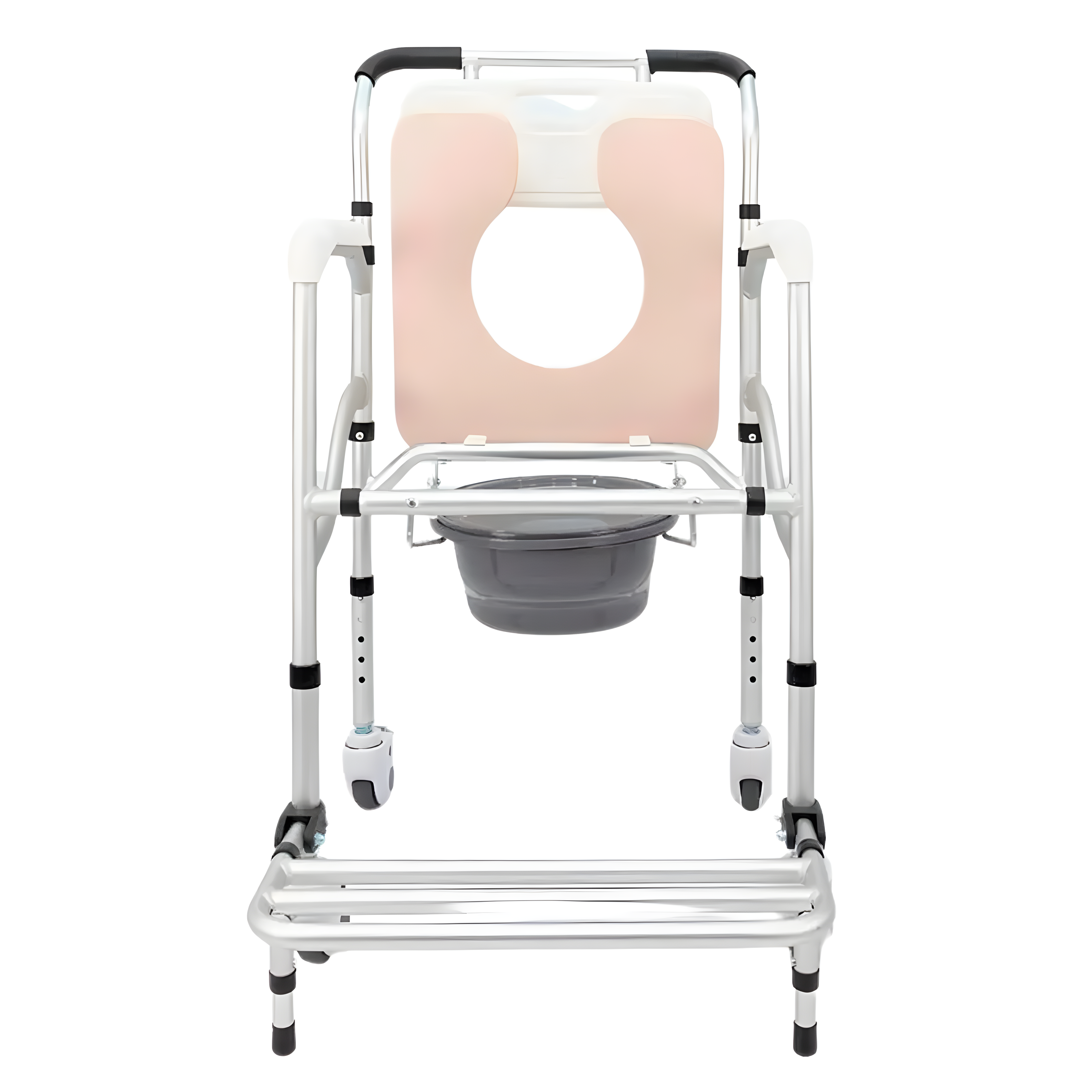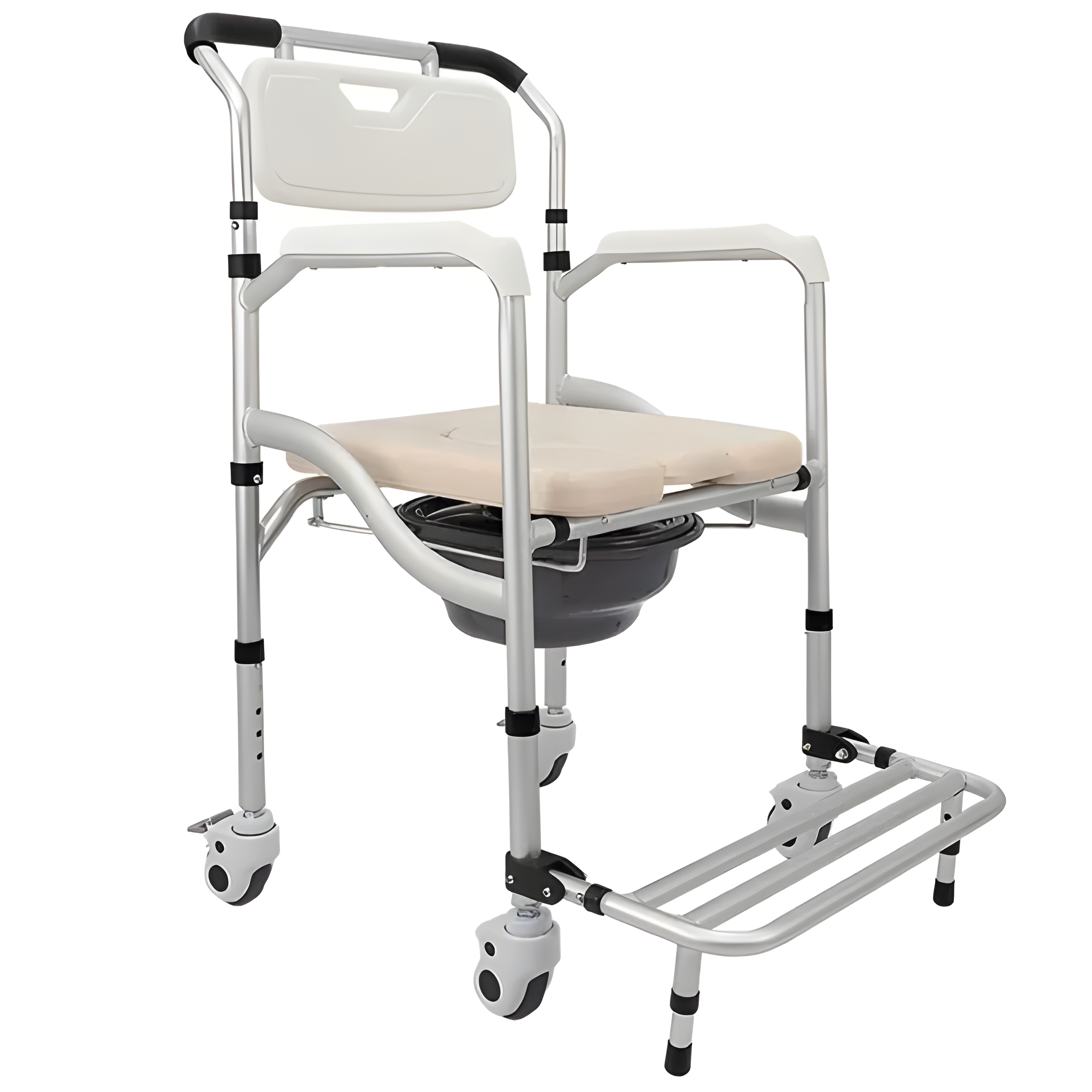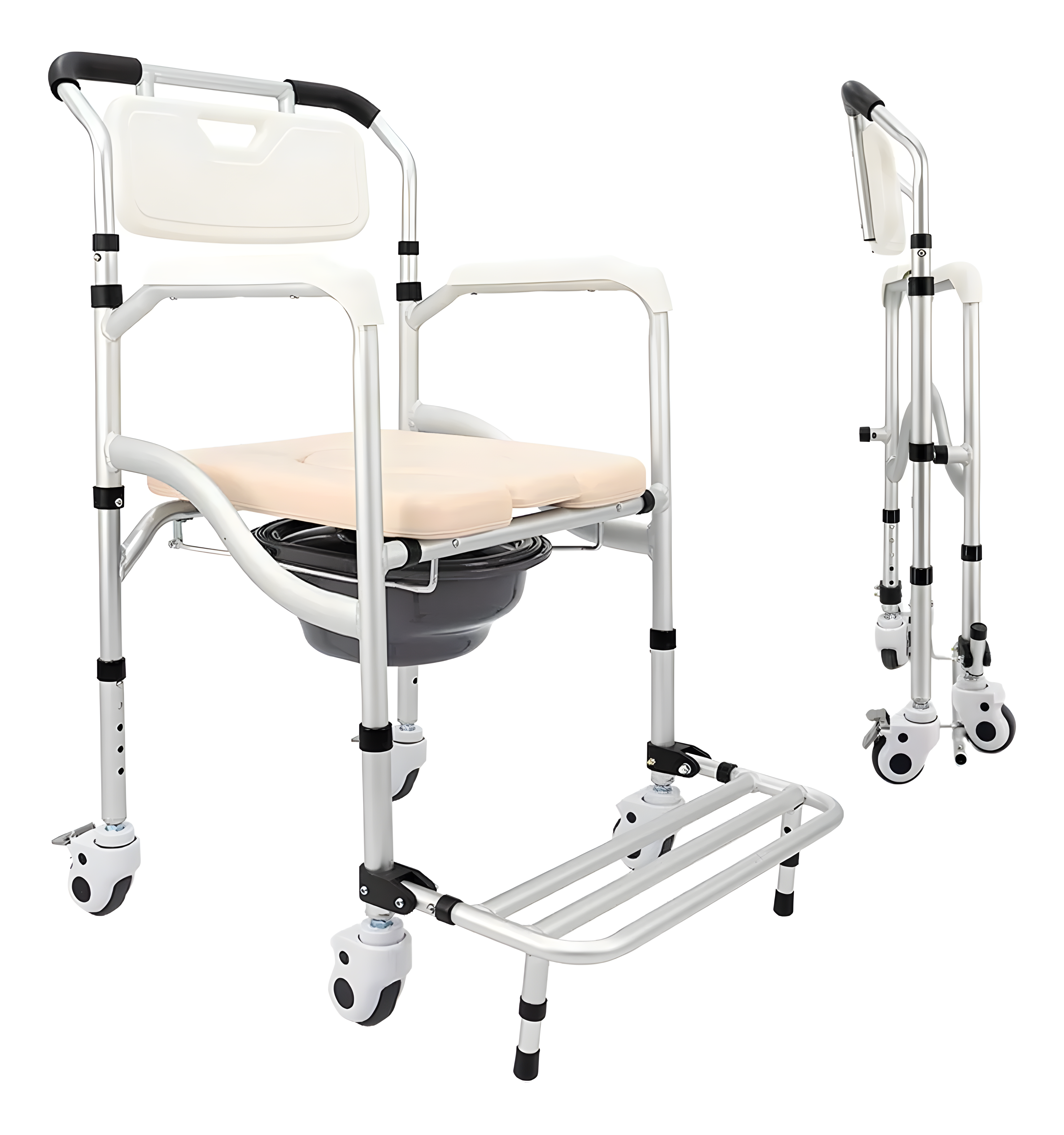 Estrutura em alumínio resistente à oxidação, dobrável, com assento almofadado (abertura frontal), coletor com tampa e rodízios giratórios (traseiros com freio). Conforto e segurança para o banho e a rotina de higiene.