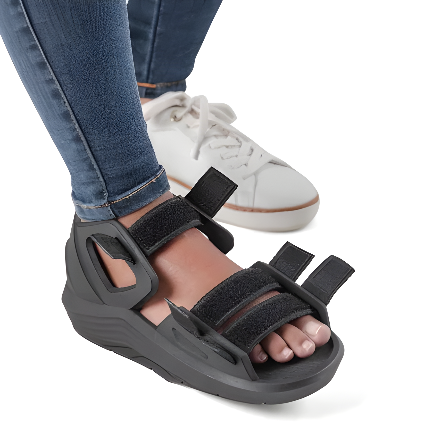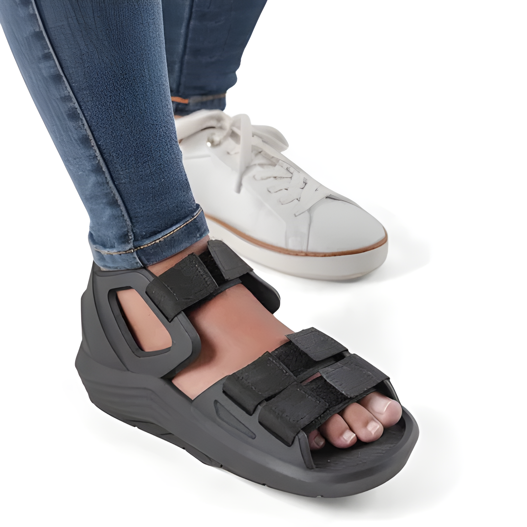 Sandália pós-operatória que protege o antepé e redistribui a carga durante a marcha, auxiliando na cicatrização após cirurgias, joanete, fraturas e lesões dos dedos/metatarsos. Pode ser usada no pé direito ou esquerdo.