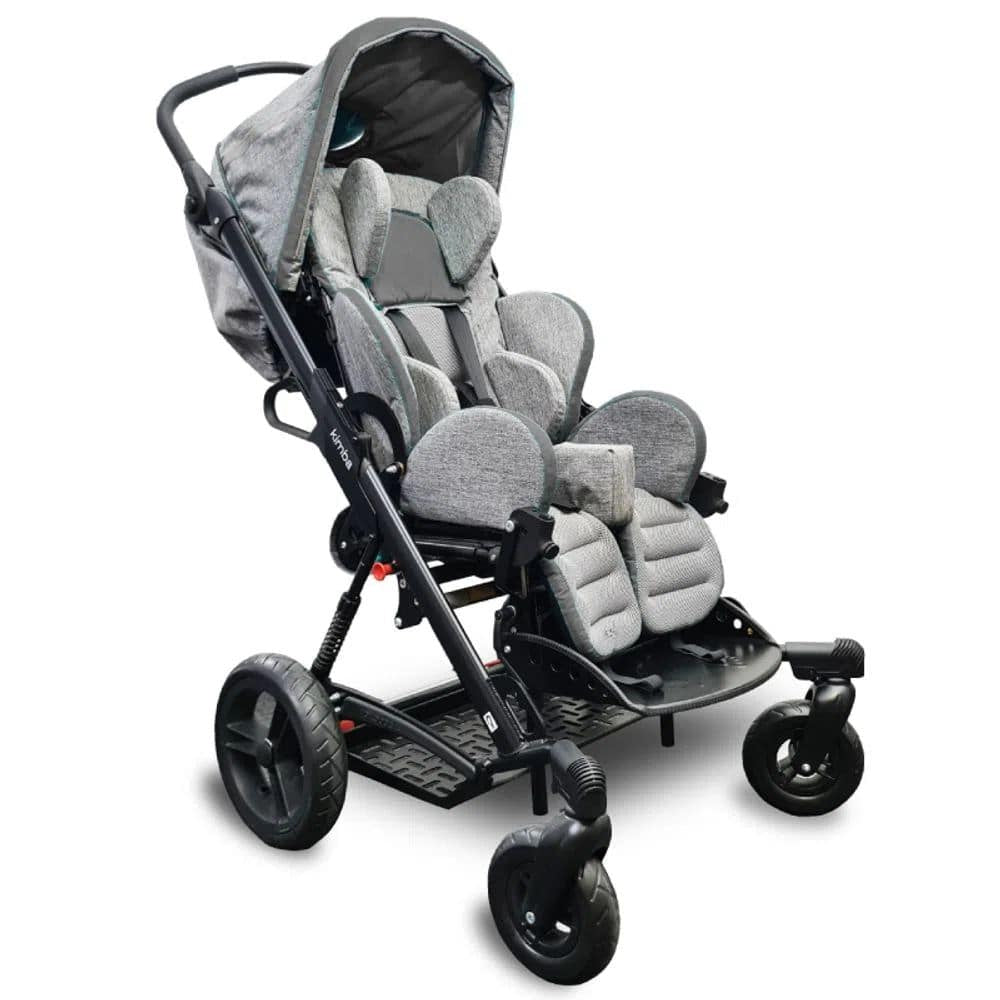 Carrinho postural infantil com chassi em alumínio leve, suspensão traseira, múltiplos ajustes de posicionamento e estofamento de fácil higienização para conforto e segurança no dia a dia.