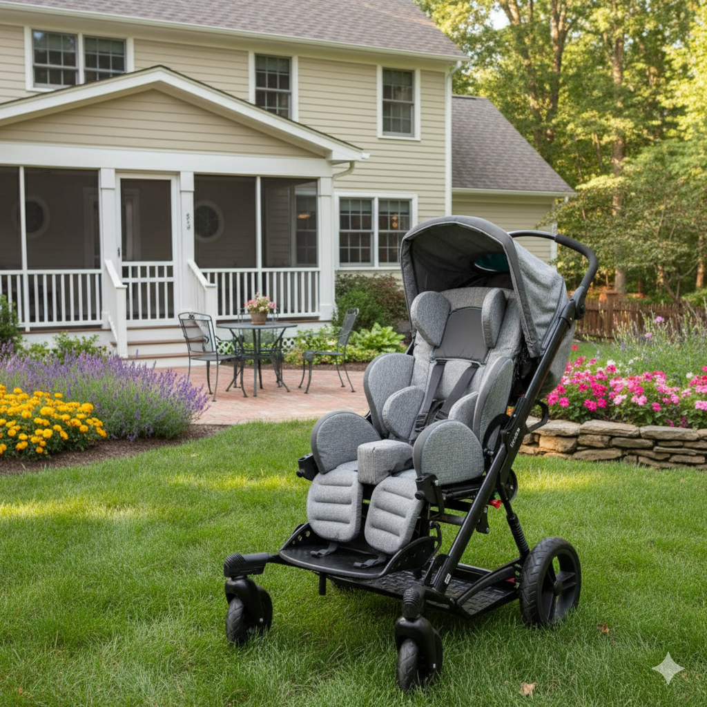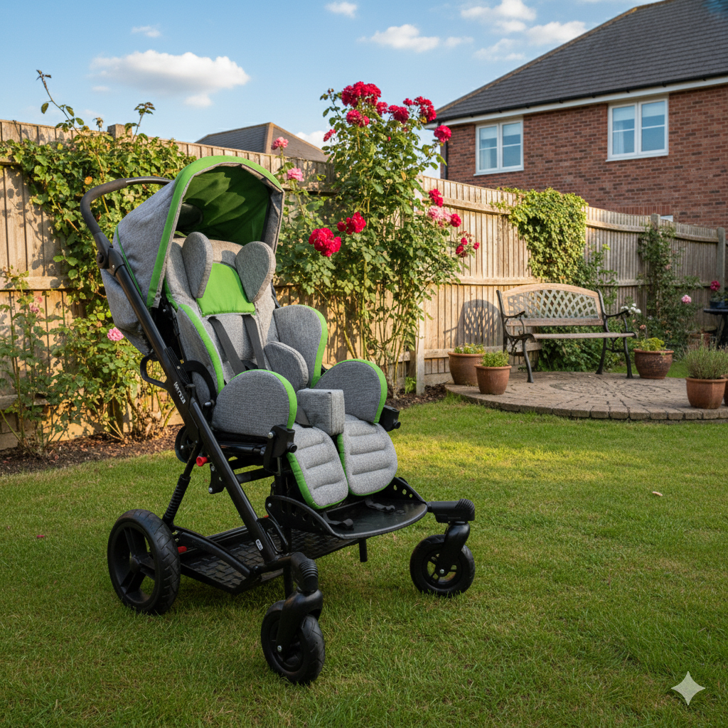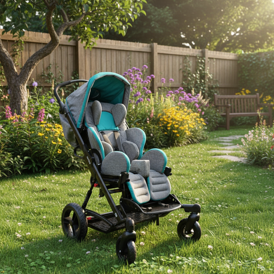 Carrinho postural infantil com chassi em alumínio leve, suspensão traseira, múltiplos ajustes de posicionamento e estofamento de fácil higienização para conforto e segurança no dia a dia.