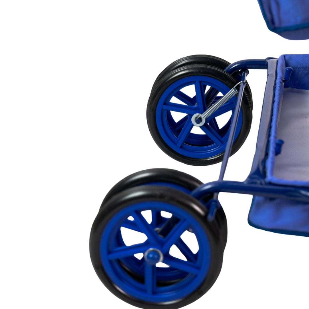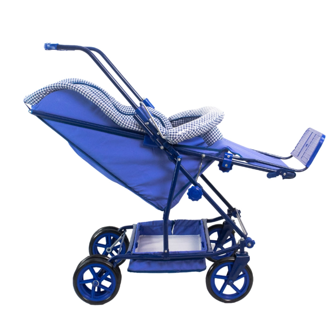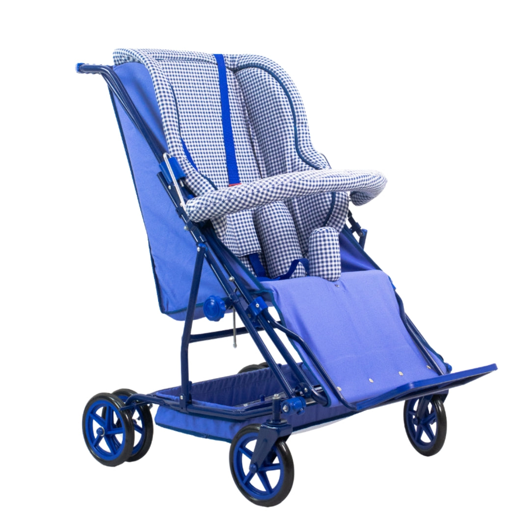 Carrinho juvenil largo, com encosto reclinável e laterais protetoras. Possui protetor frontal acolchoado, cinto peitoral de 5 pontos, abdutor de pernas e peseira regulável. Tecido duplo removível para lavar e pintura epóxi-pó (atóxica) para maior durabilidade.