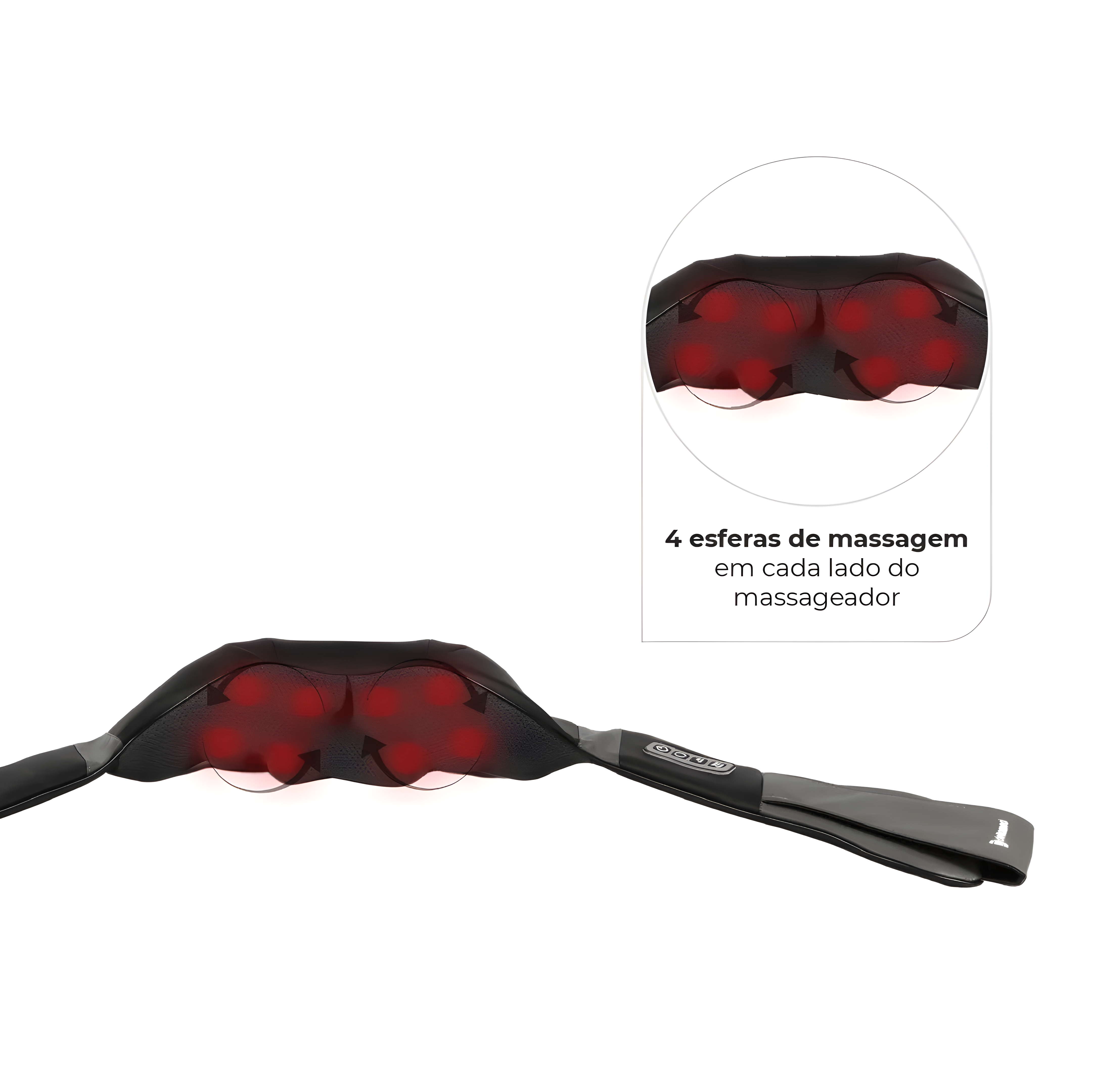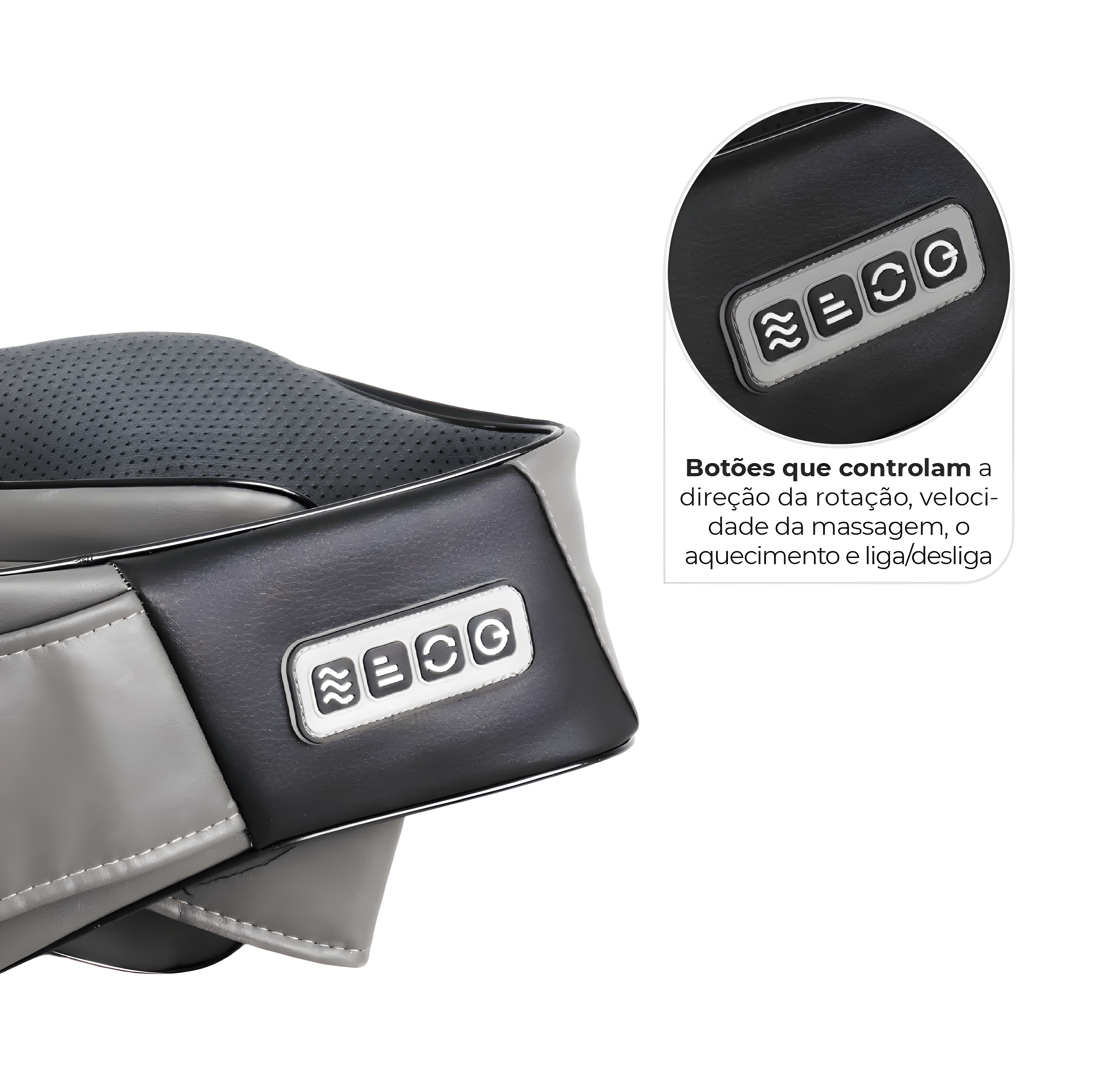Massageador em formato de colete anatômico, com 3 níveis de intensidade, aquecimento opcional e desligamento automático.