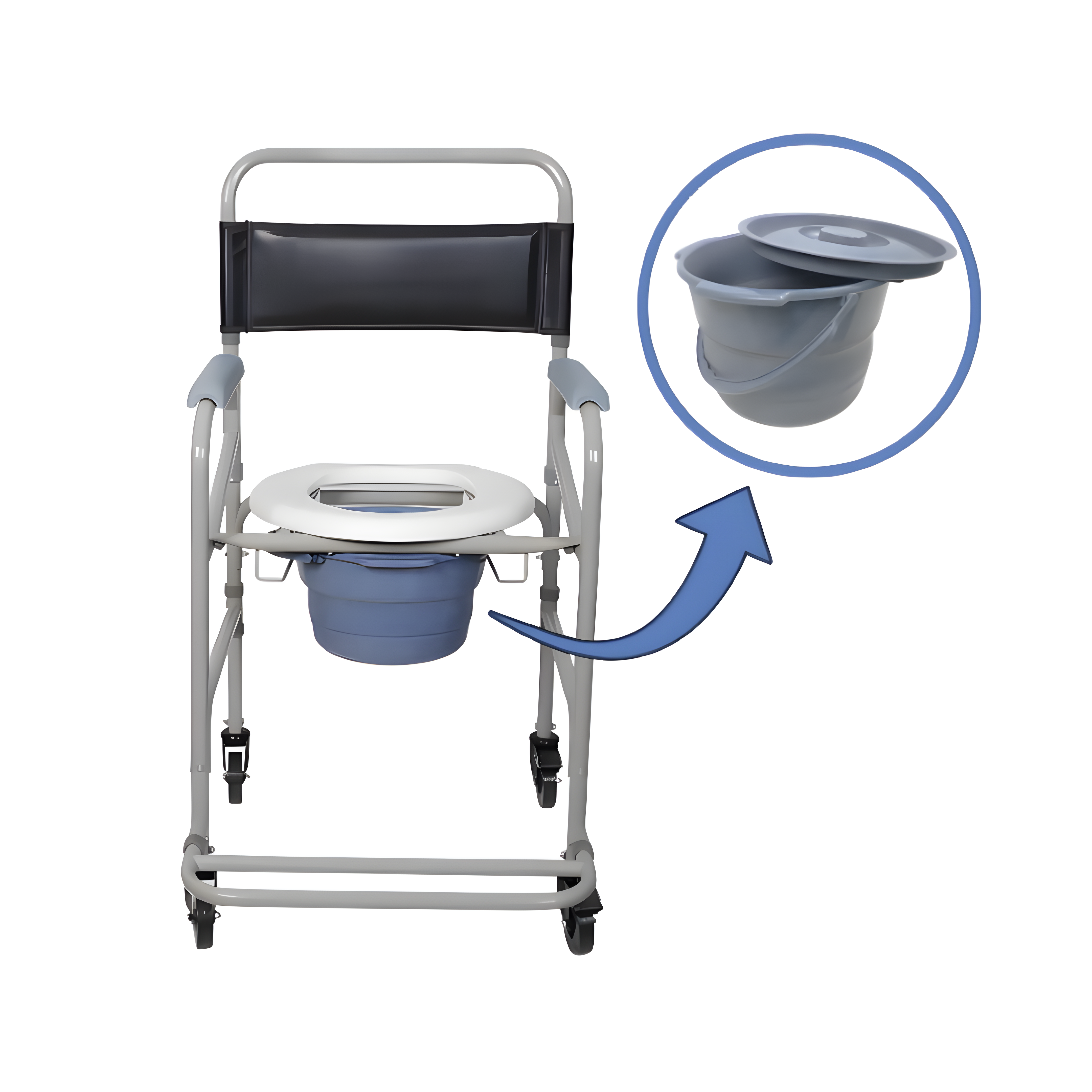 Um coletor higiênico retrátil que possibilita ao usuário realizar suas necessidades diretamente na cadeira de banho.