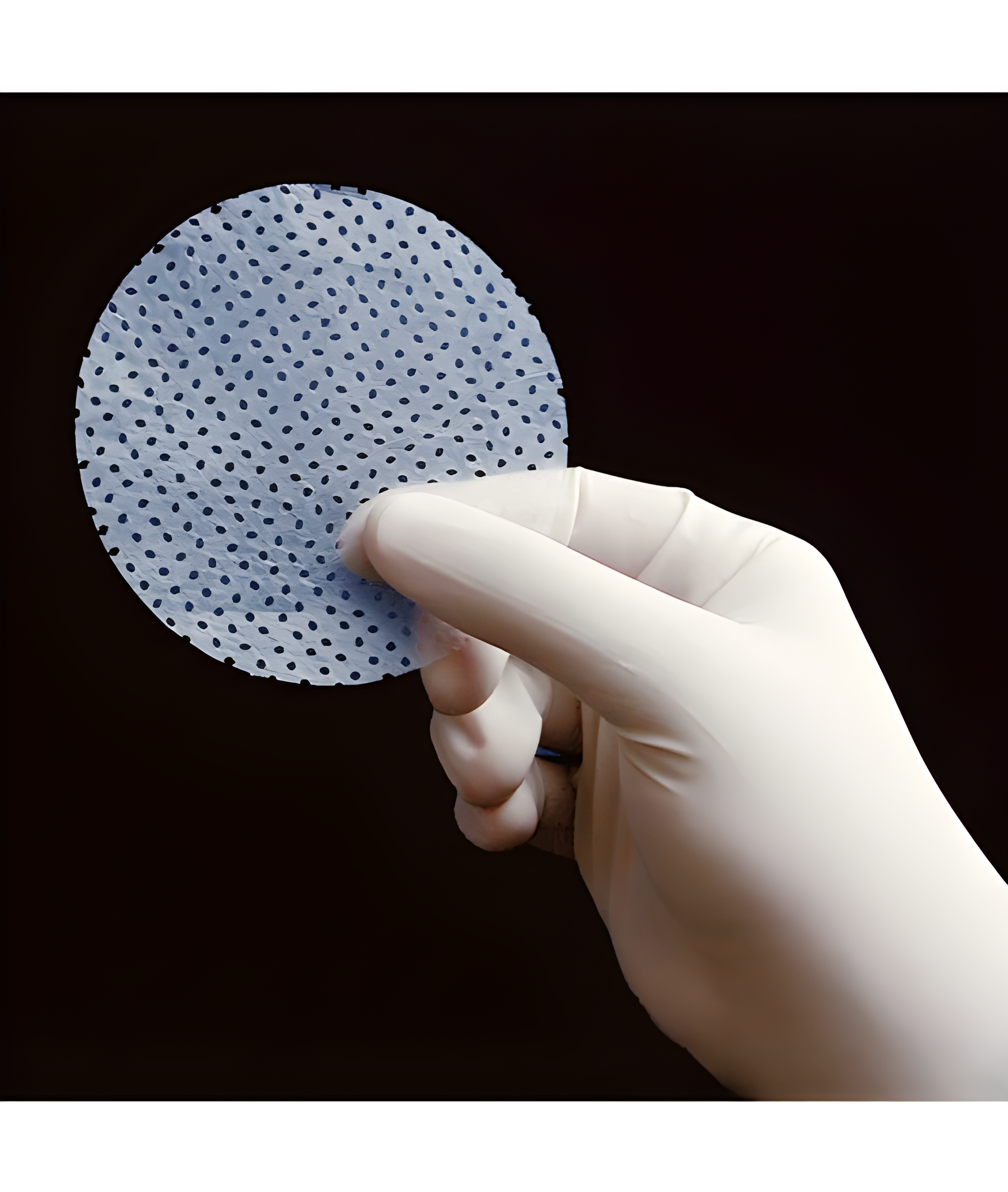 Curativo de membrana de celulose estéril, formato circular Ø 8 cm, com esporos (perfurações) de 2–3 mm para facilitar a drenagem do exsudato. Mantém ambiente úmido, reduz a aderência ao leito e proporciona trocas mais confortáveis.
