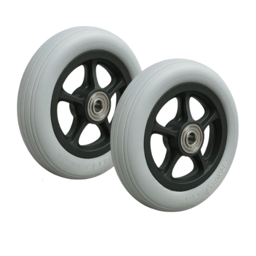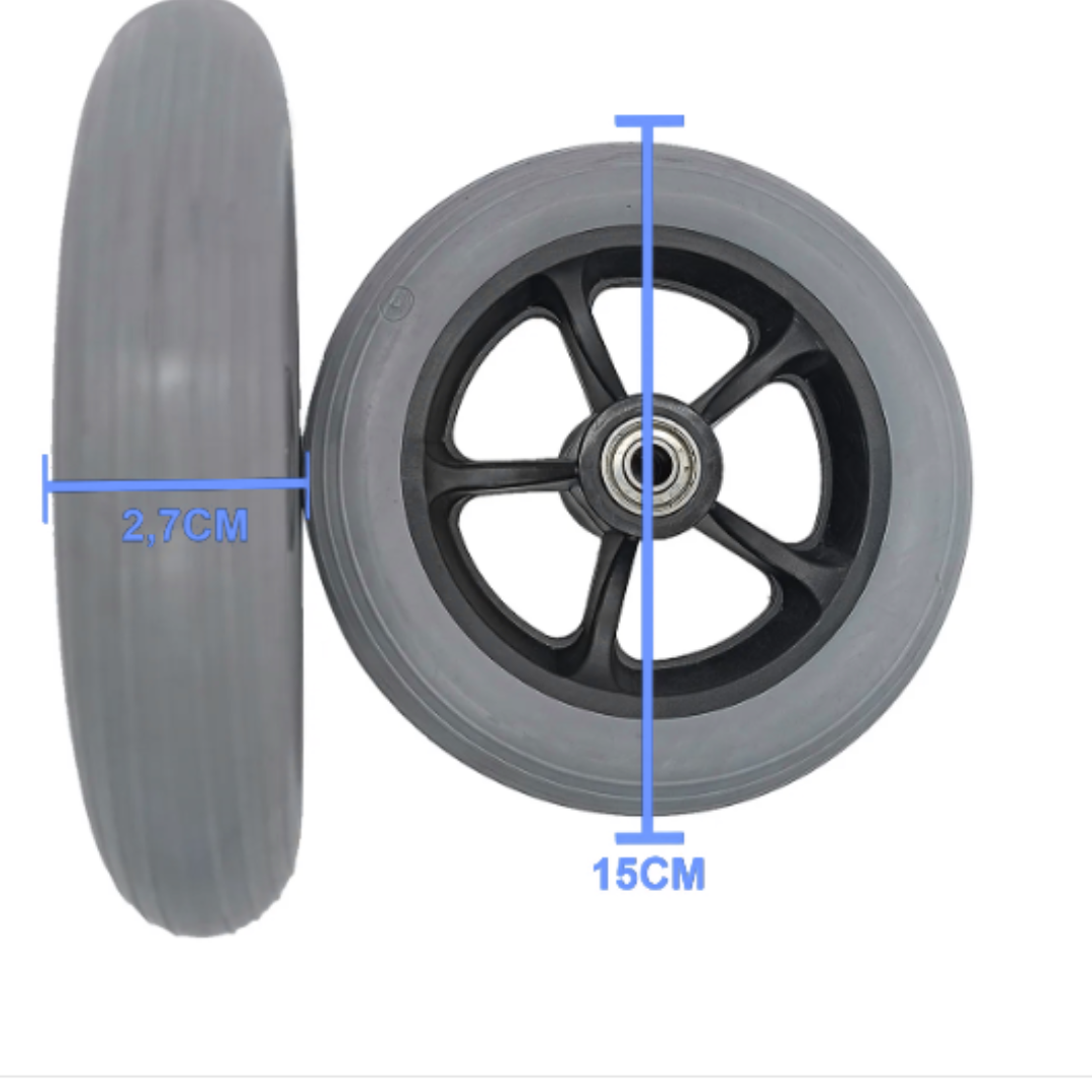 Rodinha dianteira maciça com aro em nylon e pneu cinza, ideal para reposição em cadeiras de rodas que utilizam aro 6" (?15 cm). Acompanha rolamentos e eixos completos para uma instalação simples.