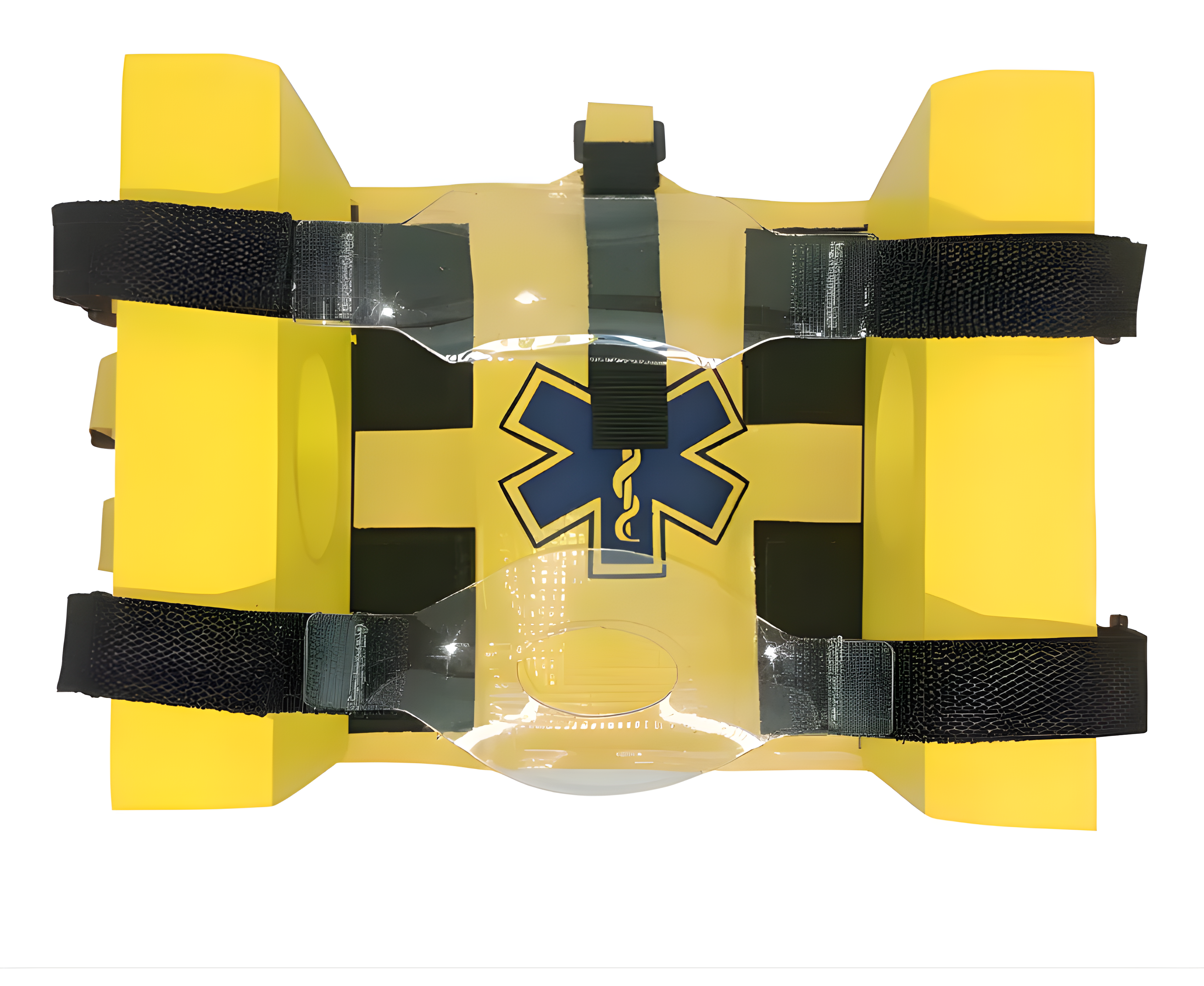 É um imobilizador lateral de cabeça para uso com prancha de imobilização e colar cervical, oferecendo estabilização segura durante o transporte do paciente. Possui laterais anatômicas e aberturas nas orelhas para avaliação clínica.