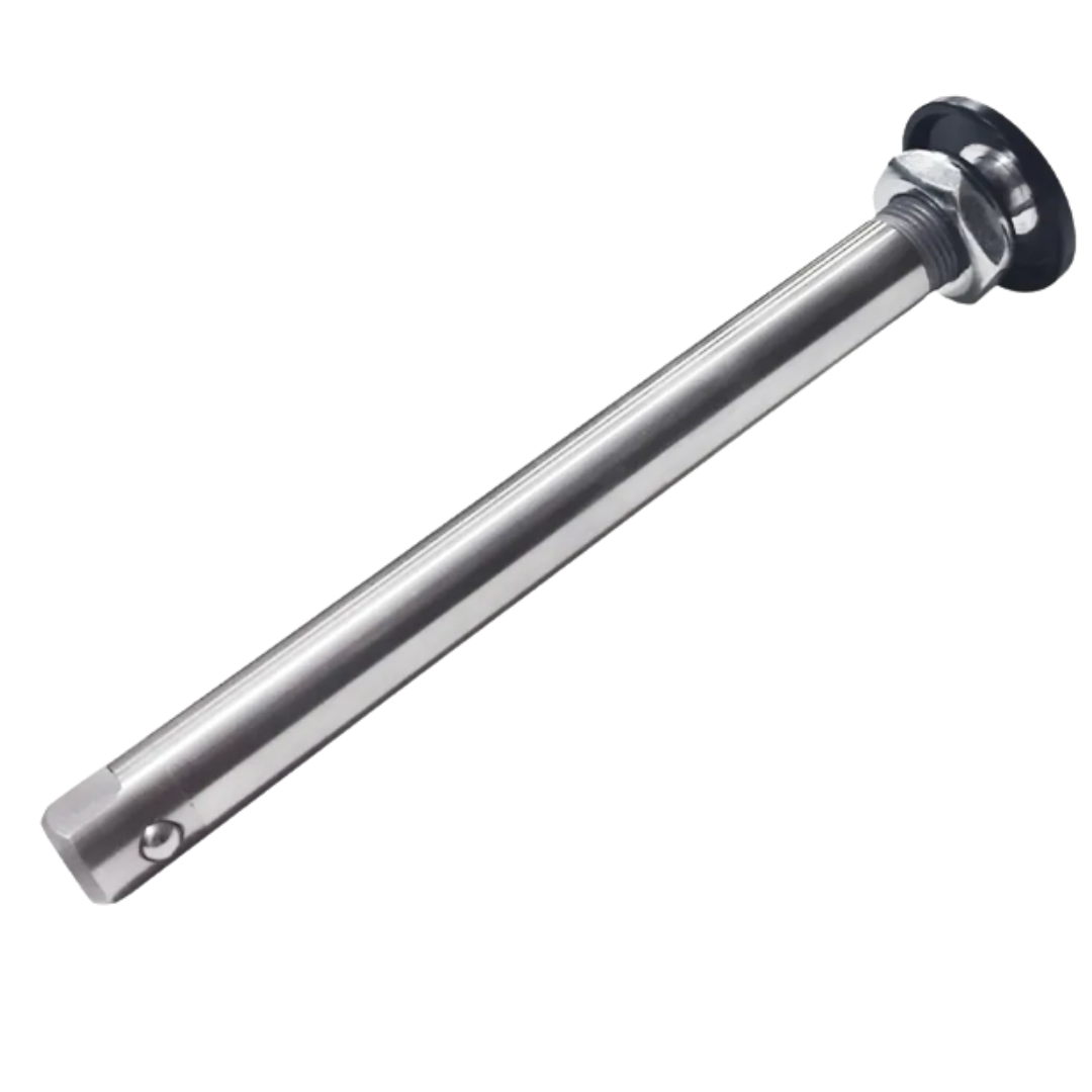 Um eixo traseiro removível com pino de 12 mm e 135 mm de comprimento total, compatível com cadeiras Ottobock e modelos que utilizem esse padrão. Permite retirar as rodas em segundos, facilitando transporte, limpeza e manutenção.