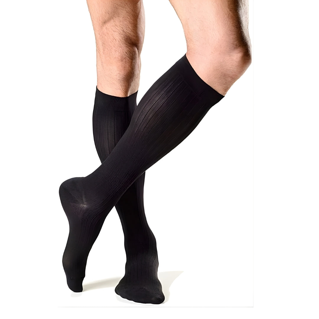 Meia de compressão suave (15–20 mmHg) para a rotina masculina — ideal para prevenir cansaço, sensação de peso e inchaço leve, além de ser ótima para viagens e longos períodos sentado ou em pé. Em casos clínicos específicos, procure orientação médica.
