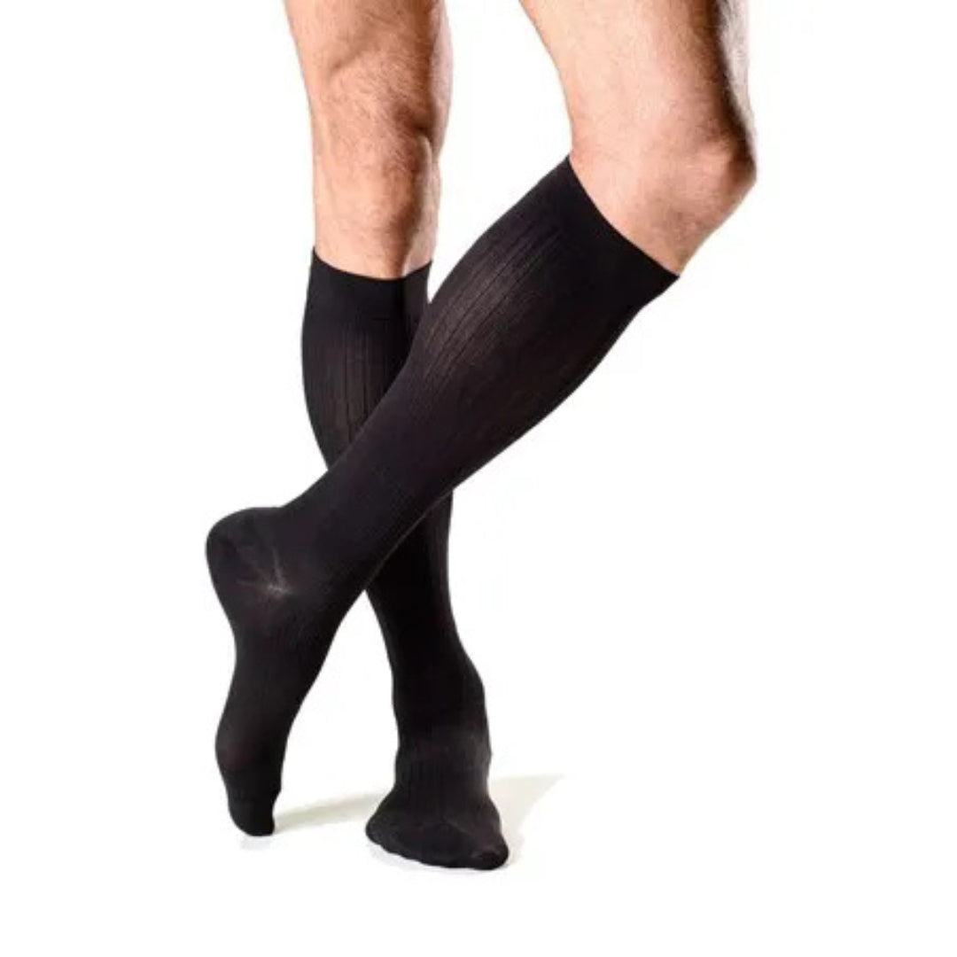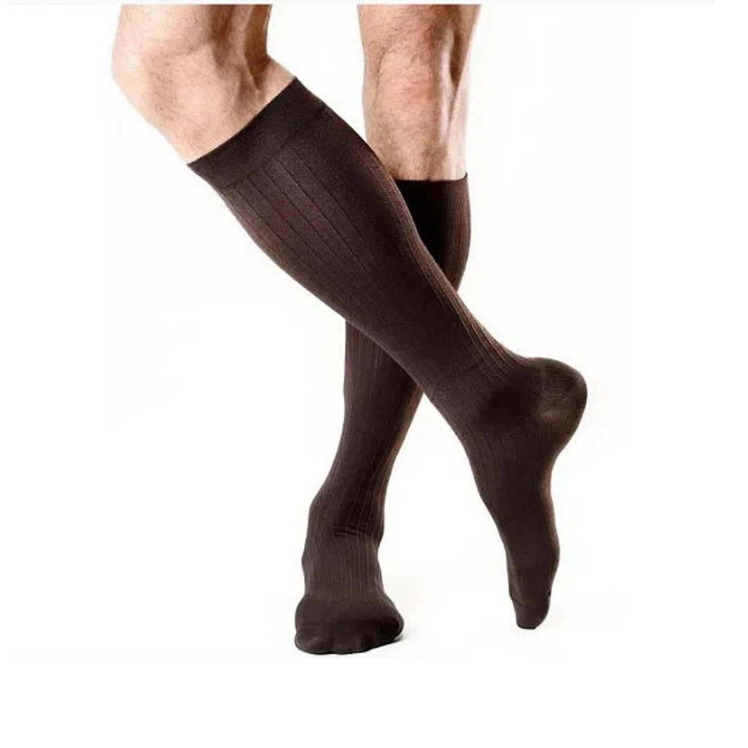 Meia de compressão suave (15–20 mmHg) para a rotina masculina — ideal para prevenir cansaço, sensação de peso e inchaço leve, além de ser ótima para viagens e longos períodos sentado ou em pé. Em casos clínicos específicos, procure orientação médica.