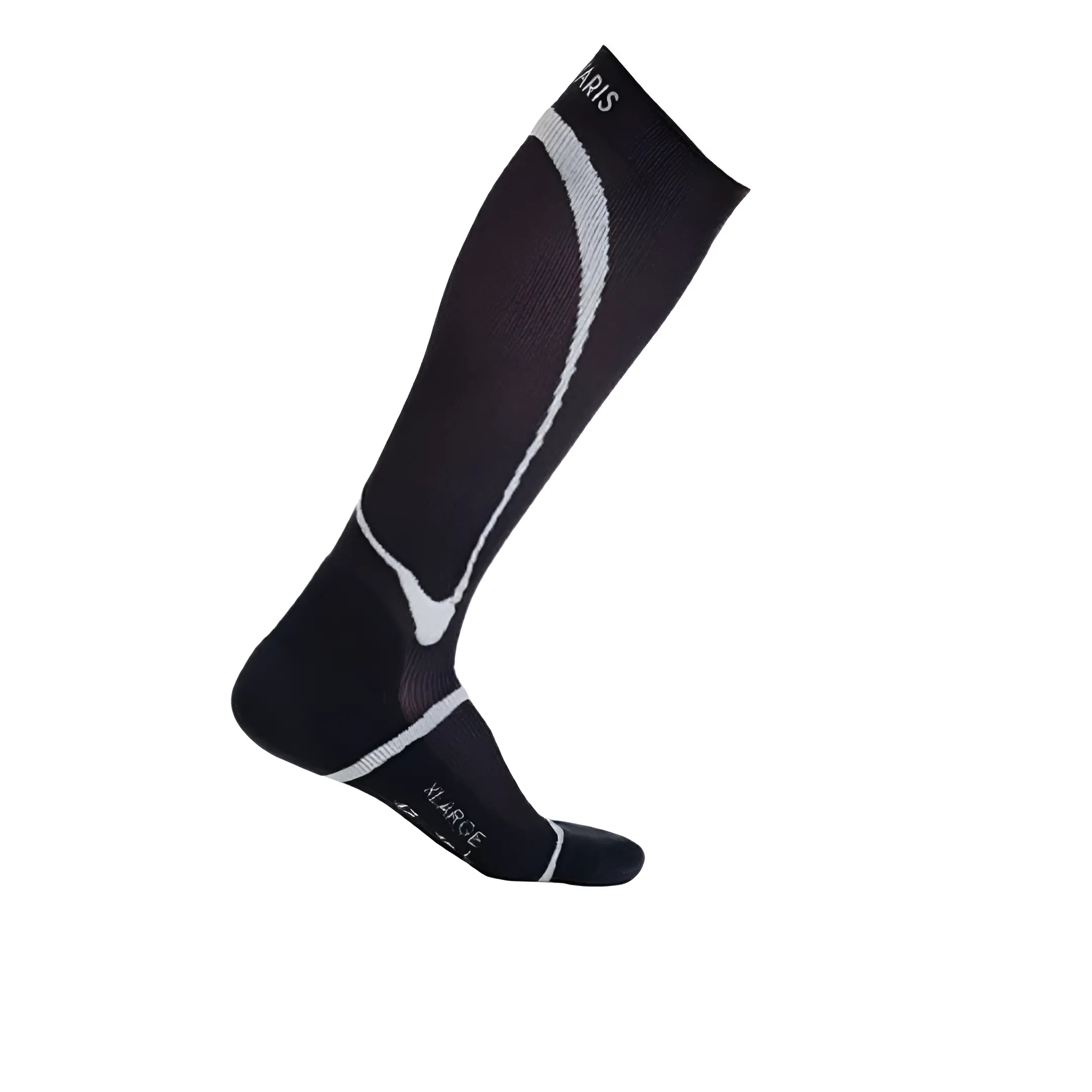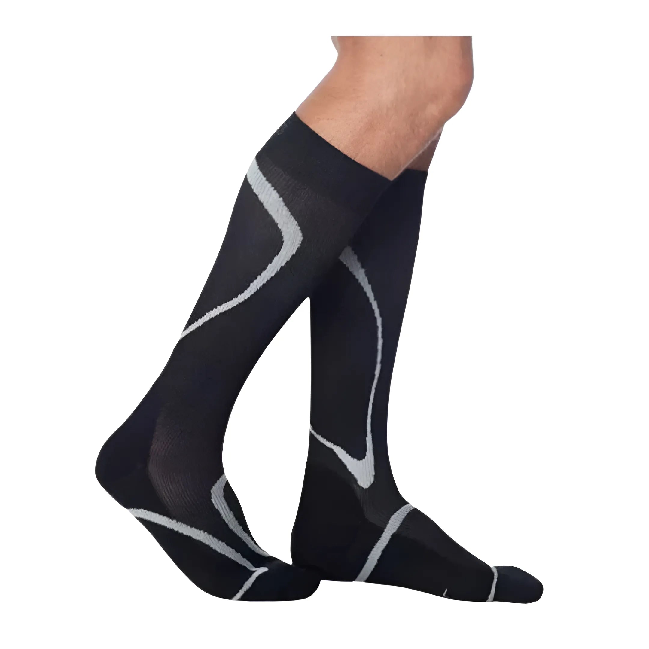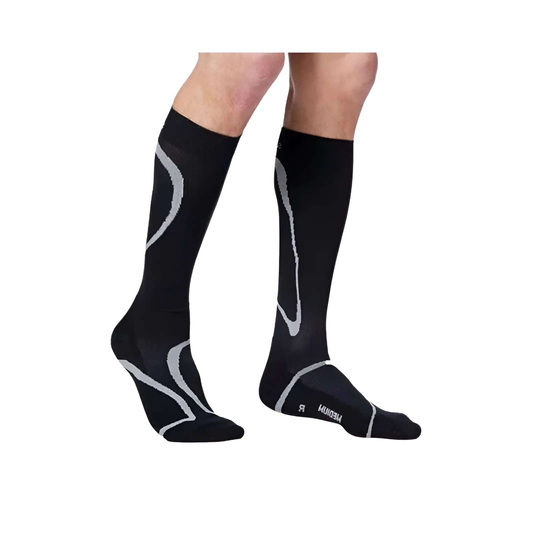 Meia de compressão esportiva para performance e recuperação: melhora o retorno venoso, reduz microvibração muscular e a sensação de fadiga durante treinos e provas. Compressão moderada (20–30 mmHg). Se você possui condições vasculares ou está em reabilitação, busque orientação profissional.