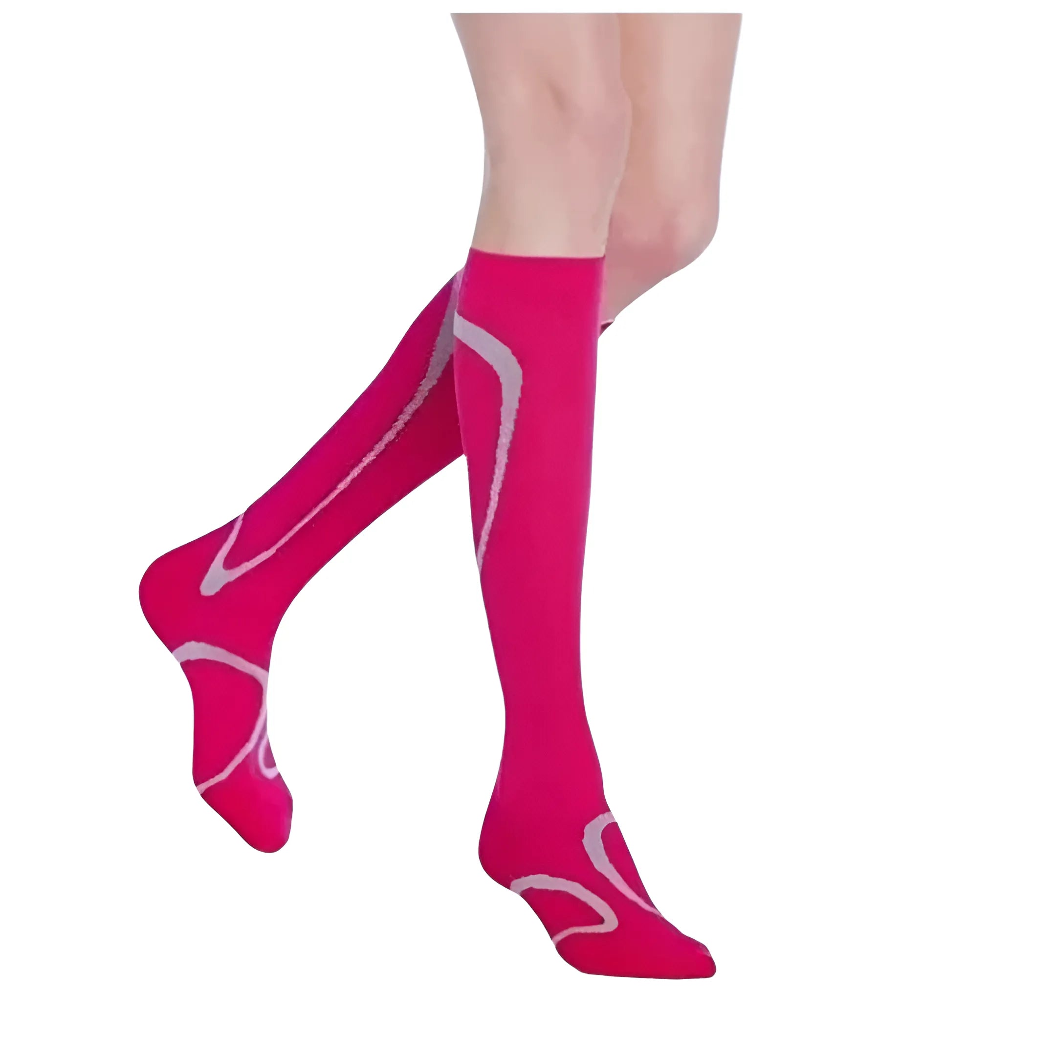 Uma meia de compressão esportiva de alta qualidade, com compressão graduada de 20-30 mmHg, indicada para melhorar a performance, reduzir a fadiga e auxiliar na recuperação pós-treino. Também pode ser utilizada sob prescrição para condições venosas.