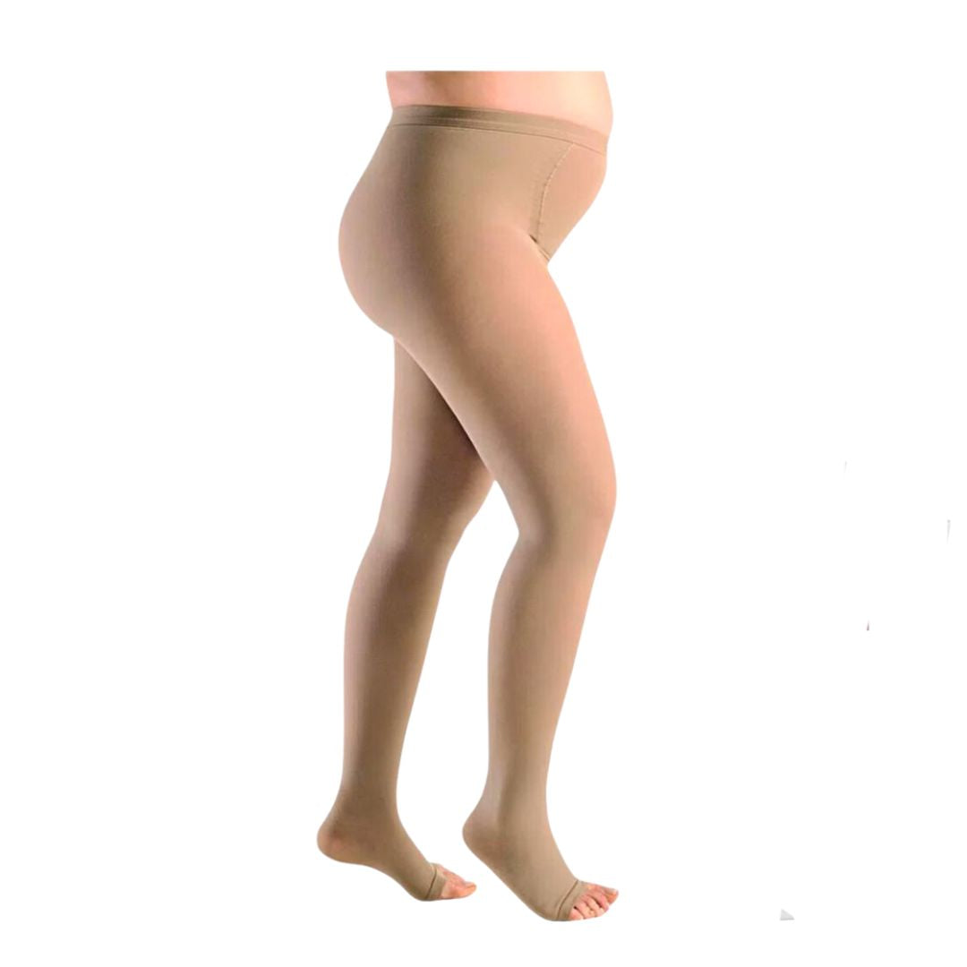 Meia terapêutica meia-calça (AT) para gestantes, com compressão moderada para controle de edemas, varizes e peso nas pernas, unindo conforto, respirabilidade e suporte abdominal.