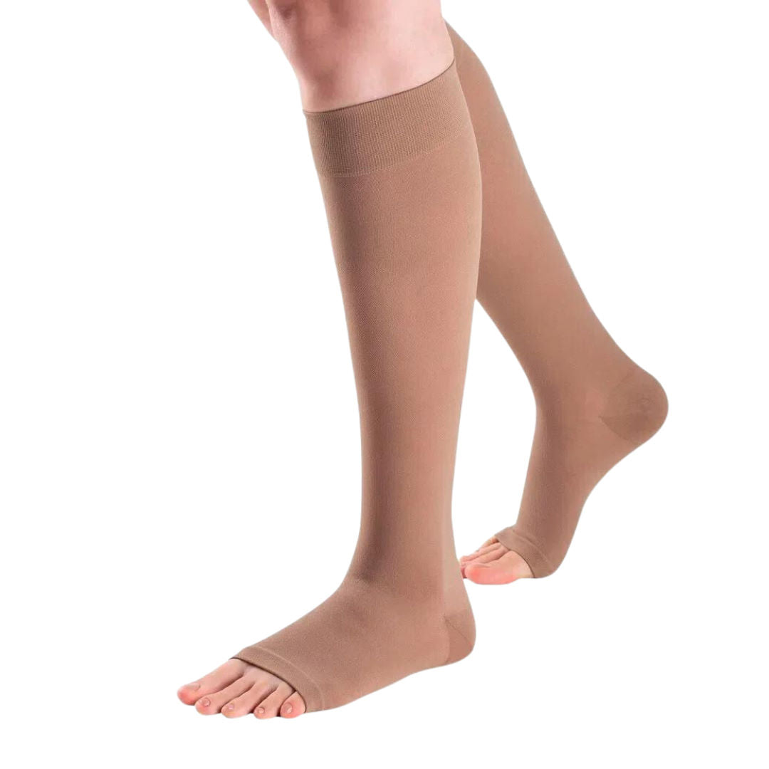 Meia de compressão terapêutica com malha opaca e toque firme, ideal para uso diário e tratamento venoso com compressão moderada 20–30 mmHg.