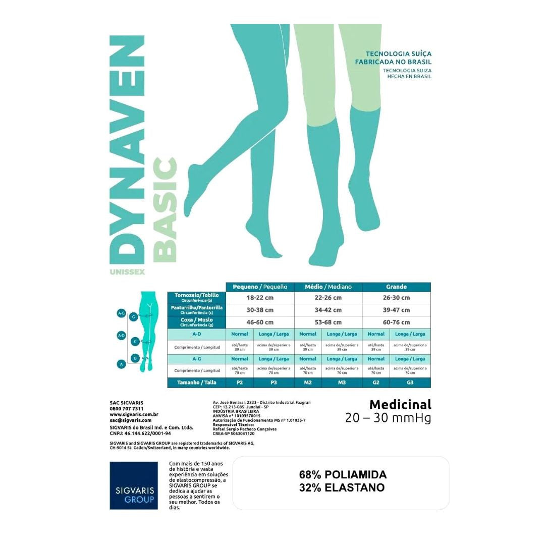 A Dynaven Basic une custo-benefício e eficácia terapêutica. Modelo 7/8 (AG – coxa), malha opaca e resistente, com compressão graduada 20–30 mmHg indicada para varizes, edemas e insuficiência venosa. Acompanha E-book com instruções de uso, medidas e cuidados. Utilize sempre com orientação médica.