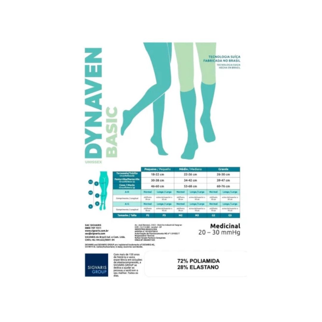 A Dynaven Basic é a linha Sigvaris com excelente custo-benefício: malha opaca, resistente e confortável para o dia a dia. Modelo Meia-Calça (AT – cintura) com compressão graduada 20–30 mmHg, indicada para varizes, edemas e insuficiência venosa. Acompanha E-book com dicas de uso, medidas e conservação. Utilize sempre com orientação médica.