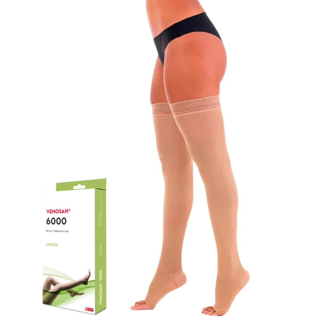 A Venosan 6000 7/8 (AG – coxa) une compressão graduada 20–30 mmHg a um design elegante e toque sedoso. Ideal para varizes, edemas e insuficiência venosa, com visual discreto na cor bege e modelo pé aberto. Utilize sempre com orientação médica.