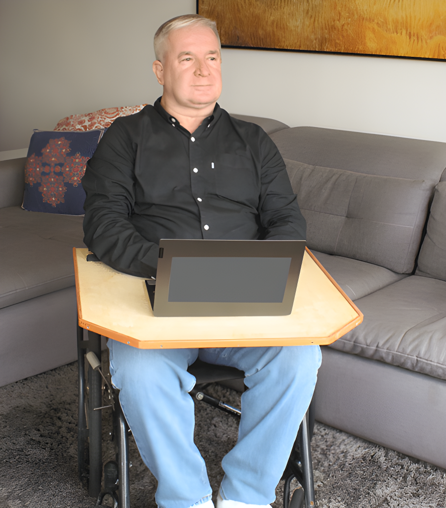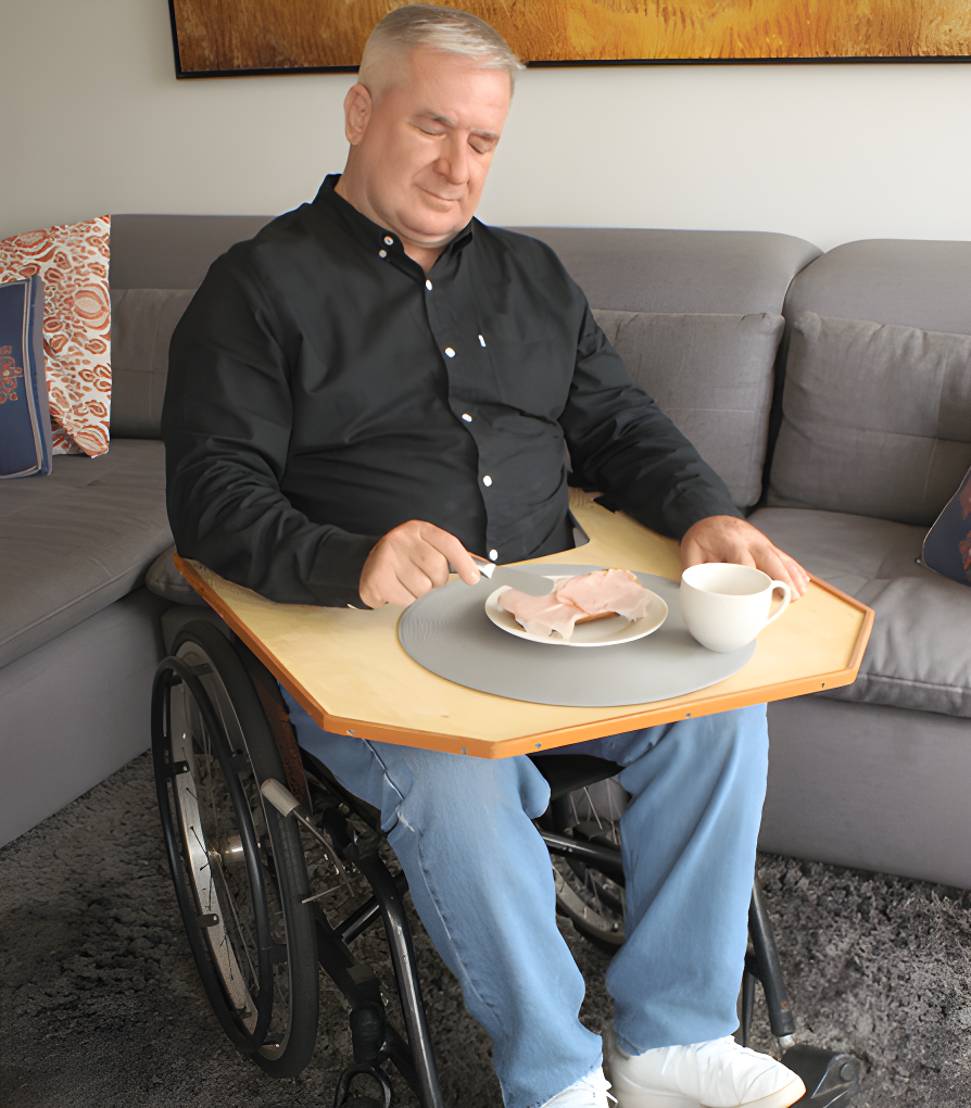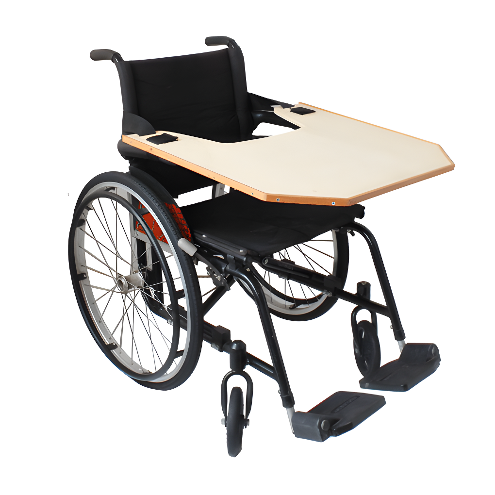 Superfície de apoio 100% madeira para atividades como refeições, leitura e trabalho. Instalação rápida com cintas de velcro, compatível com a maioria das cadeiras de rodas e capacidade até 3 kg. Disponível nos tamanhos P, M e G.