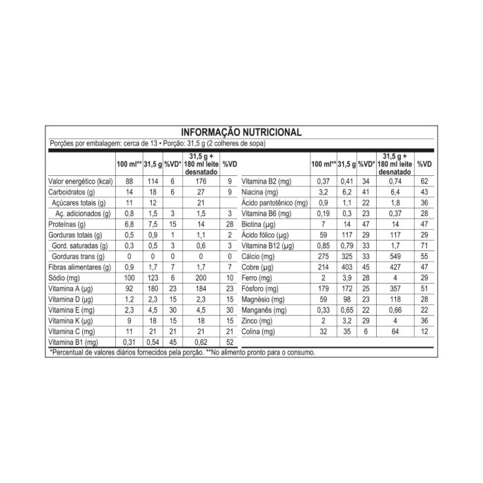 Mistura instantânea em água ou leite, sem grumos, pronta em segundos para seu momento de nutrição.