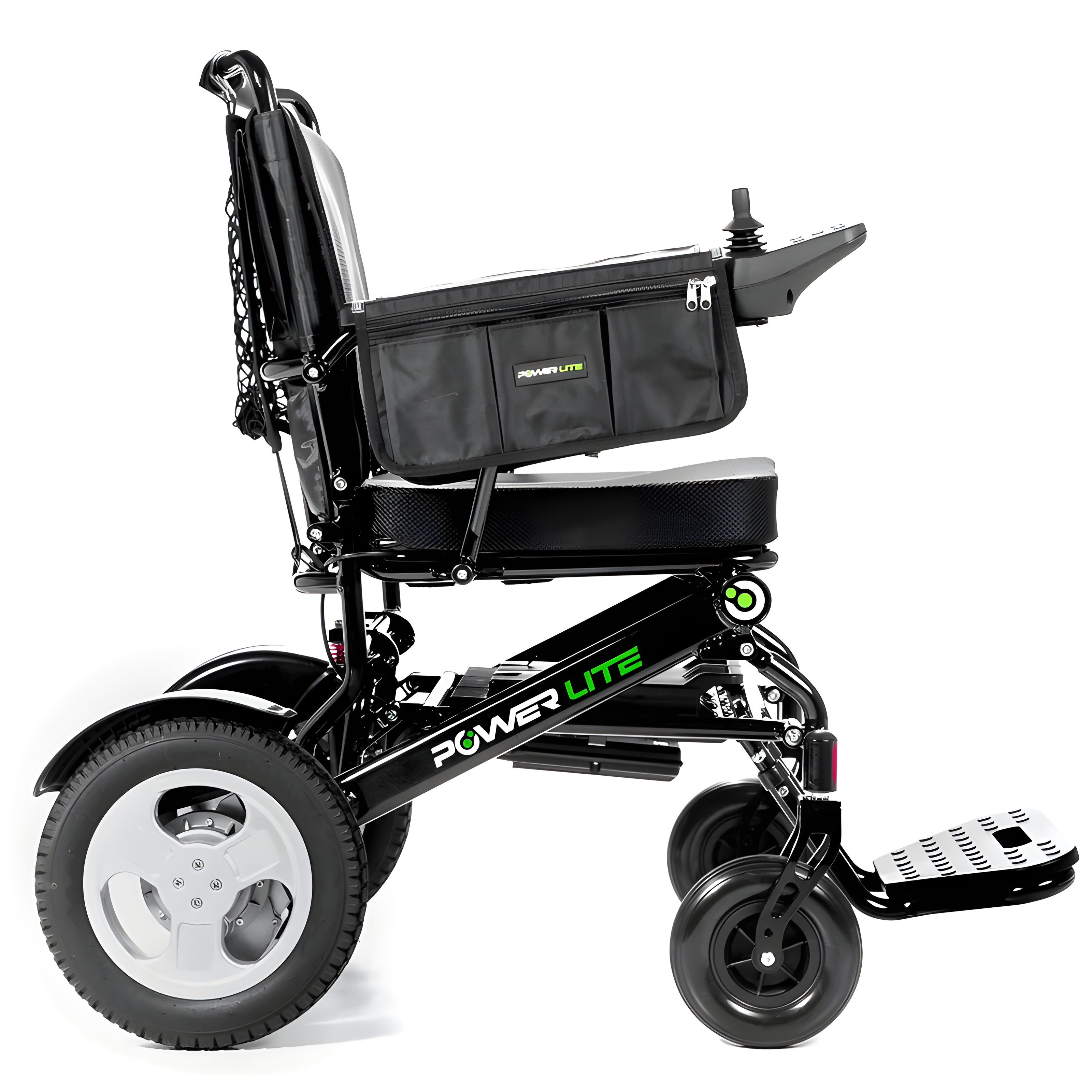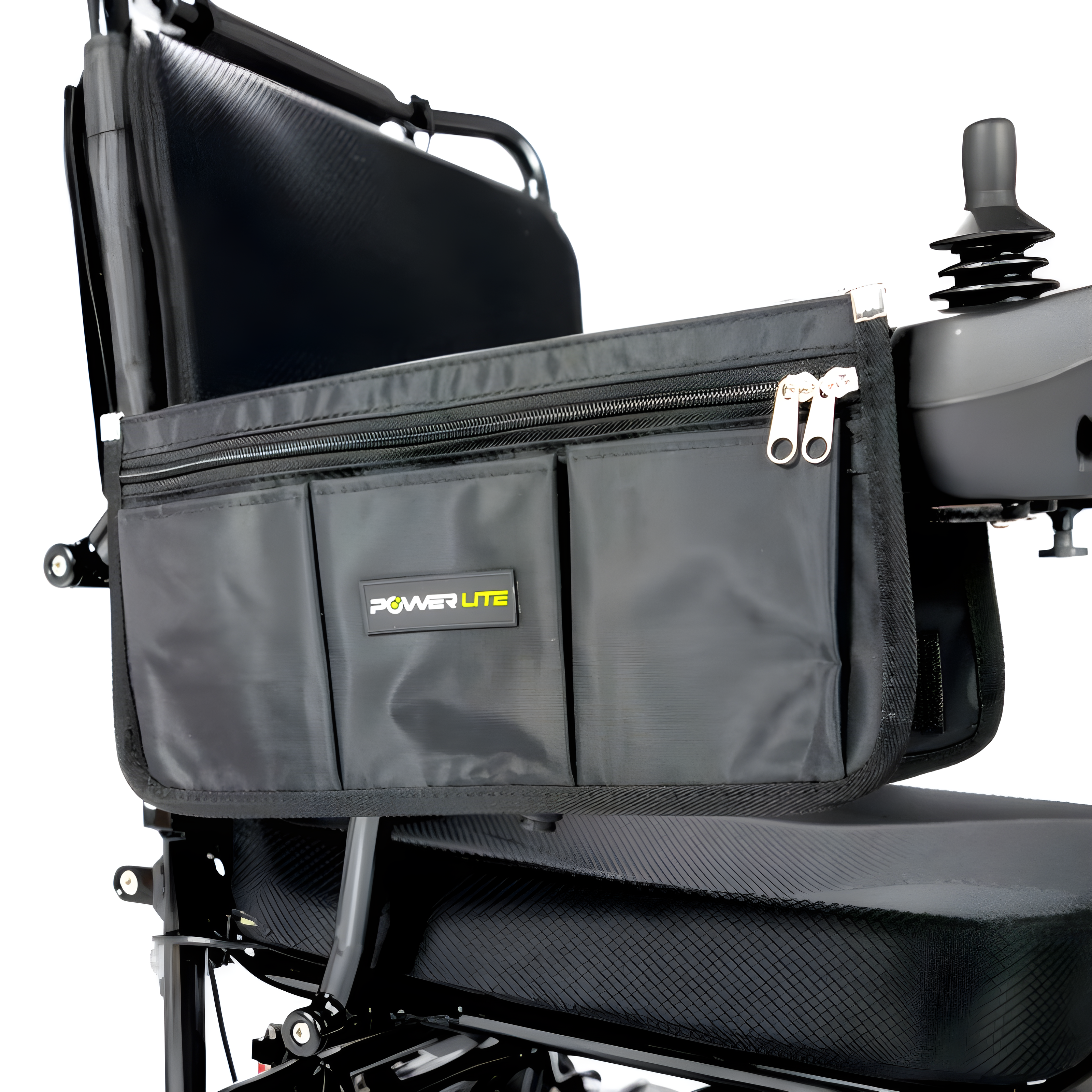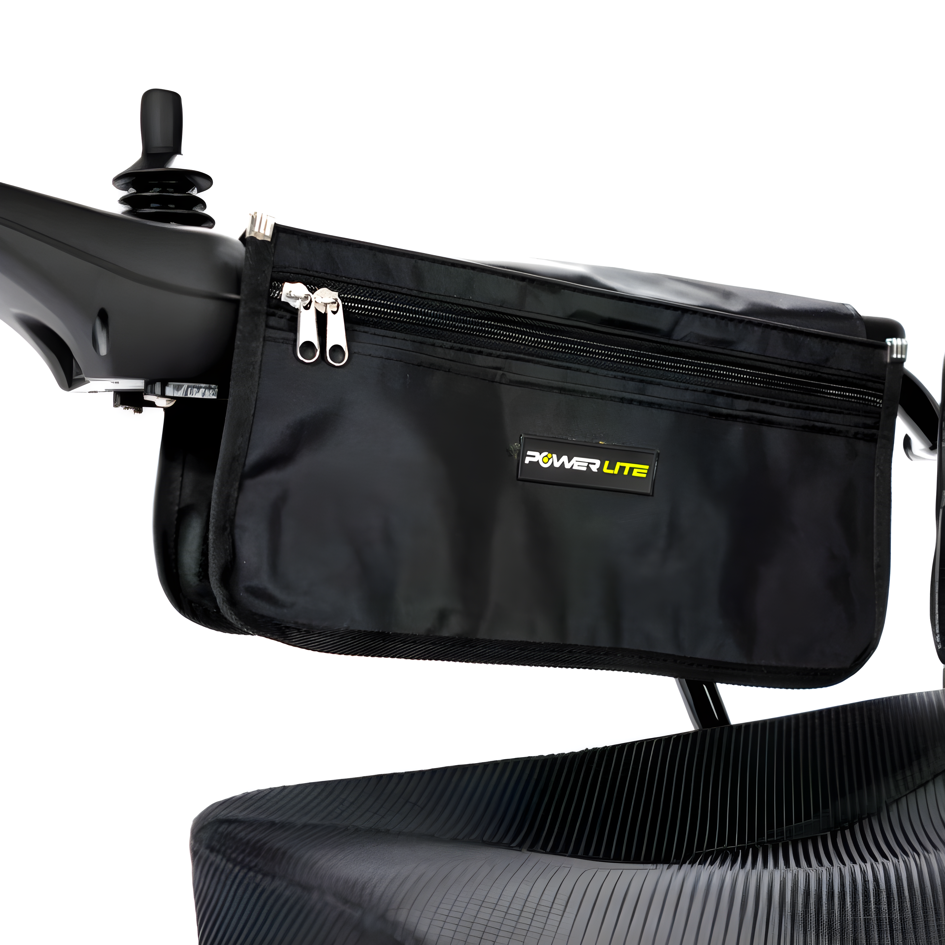 Pochete lateral para cadeiras de rodas motorizadas Power Lite, resistente à água, com vários compartimentos com zíper para levar celular, carteira, garrafa e itens do dia a dia. Compatível com os modelos Compact In, Auto, Street e Carbon.