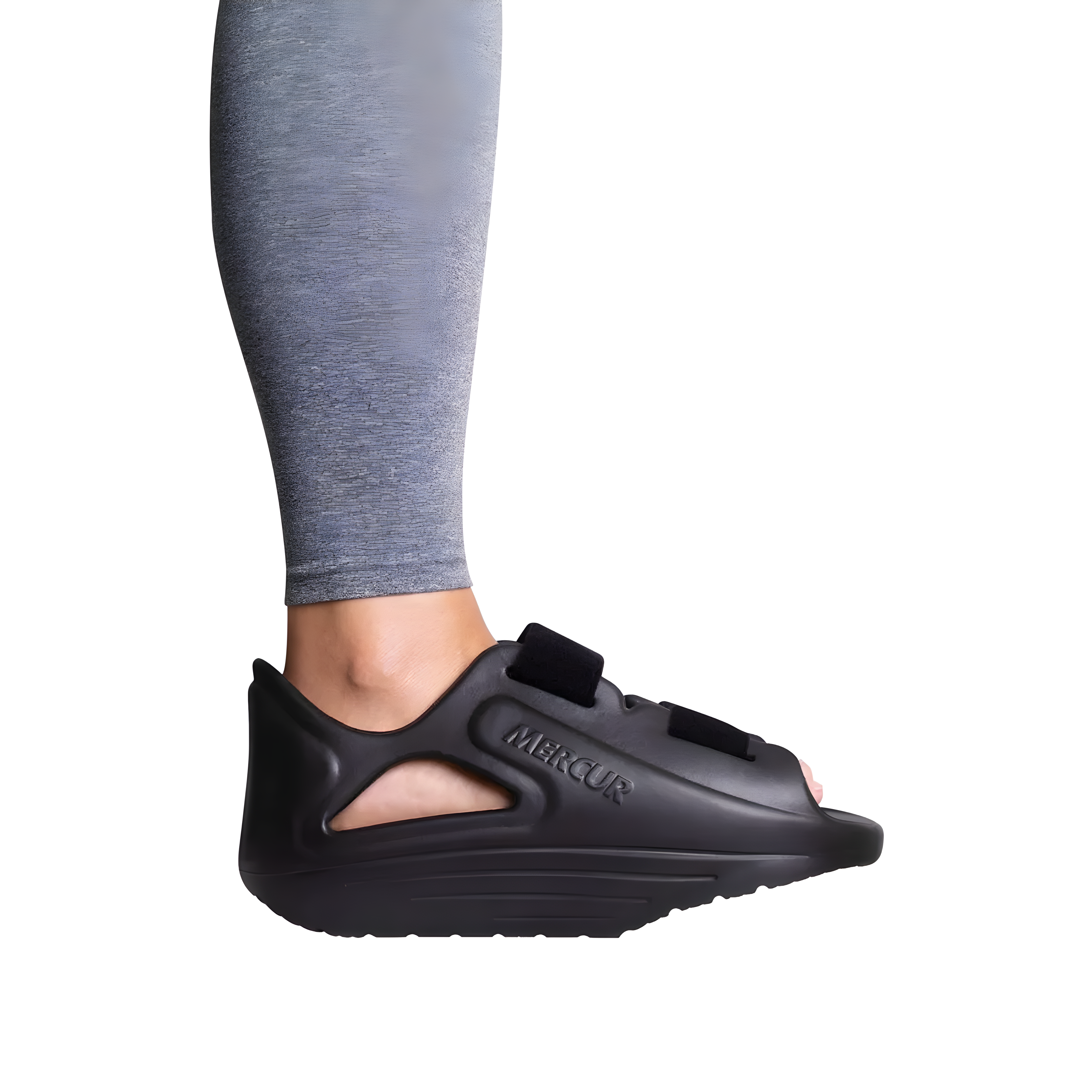 É uma sandália ortopédica pós-operatória projetada para proteger o antepé e reduzir a carga sobre os metatarsos, ao direcionar o apoio para o calcanhar. Confeccionada em EVA anatômico com fechos aderentes, oferece estabilidade com ajuste simples.