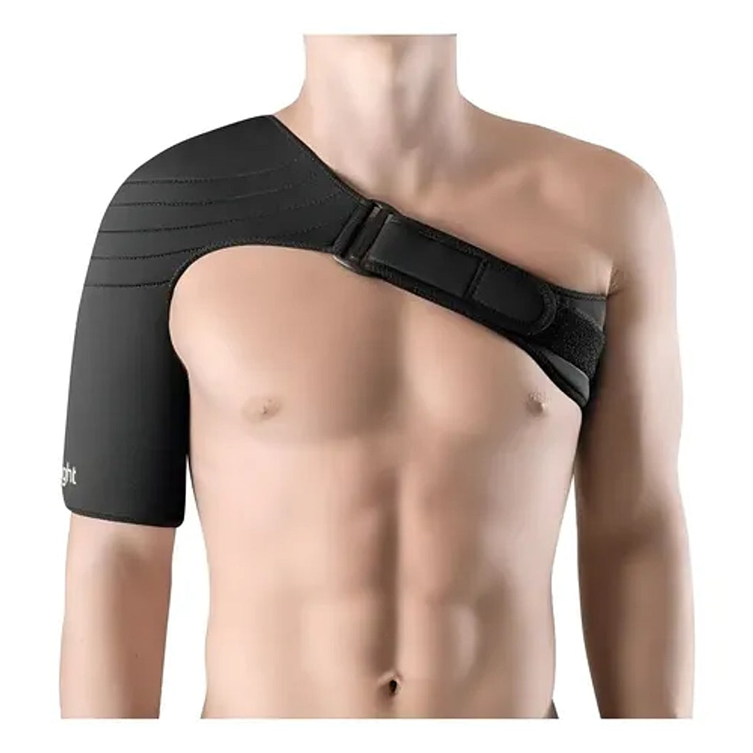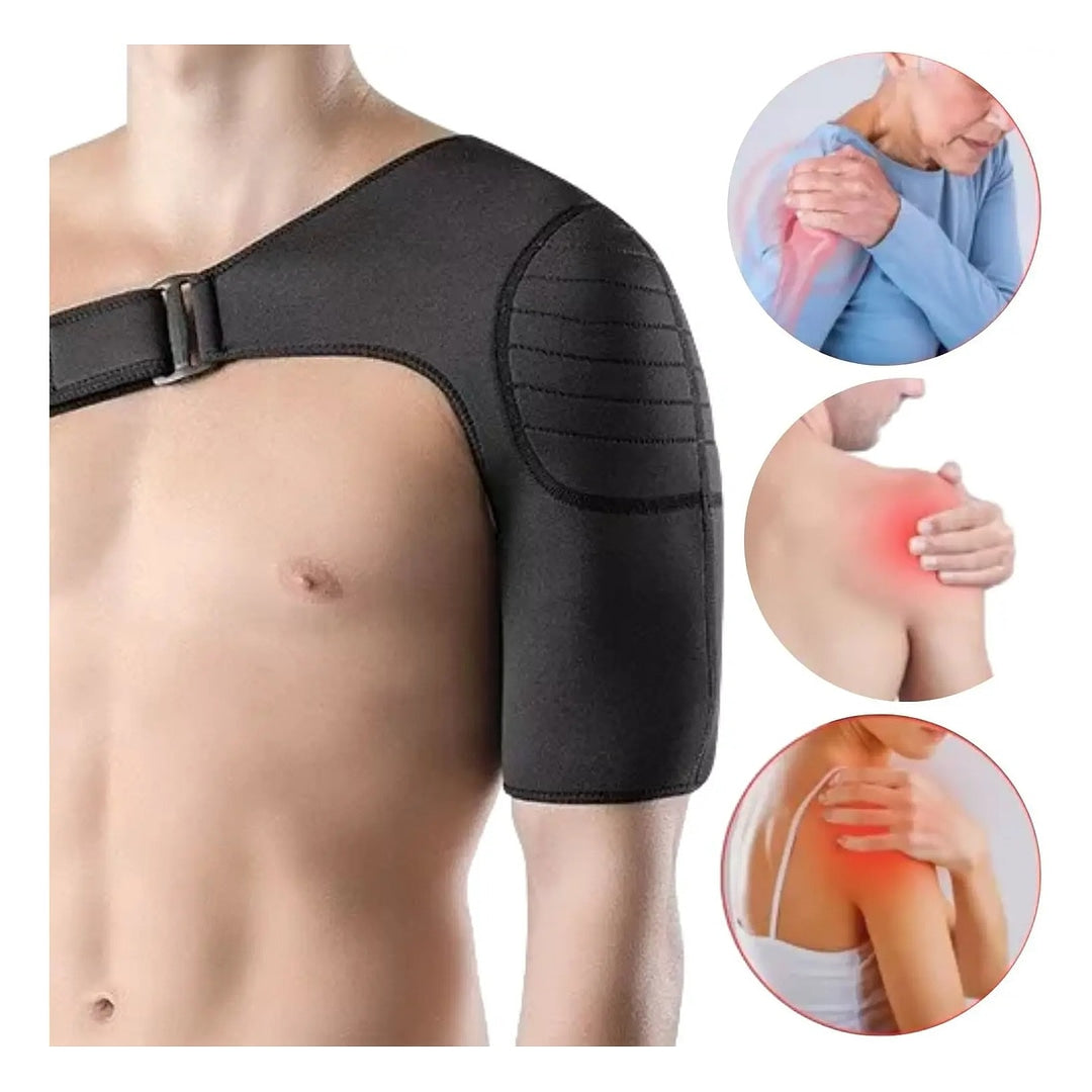 O material em neoprene retém o calor corporal, contribuindo para o alívio de dores musculares e articulares. O design bilateral permite o uso em ambos os ombros, e o fecho autocolante garante um ajuste preciso e seguro ao corpo.