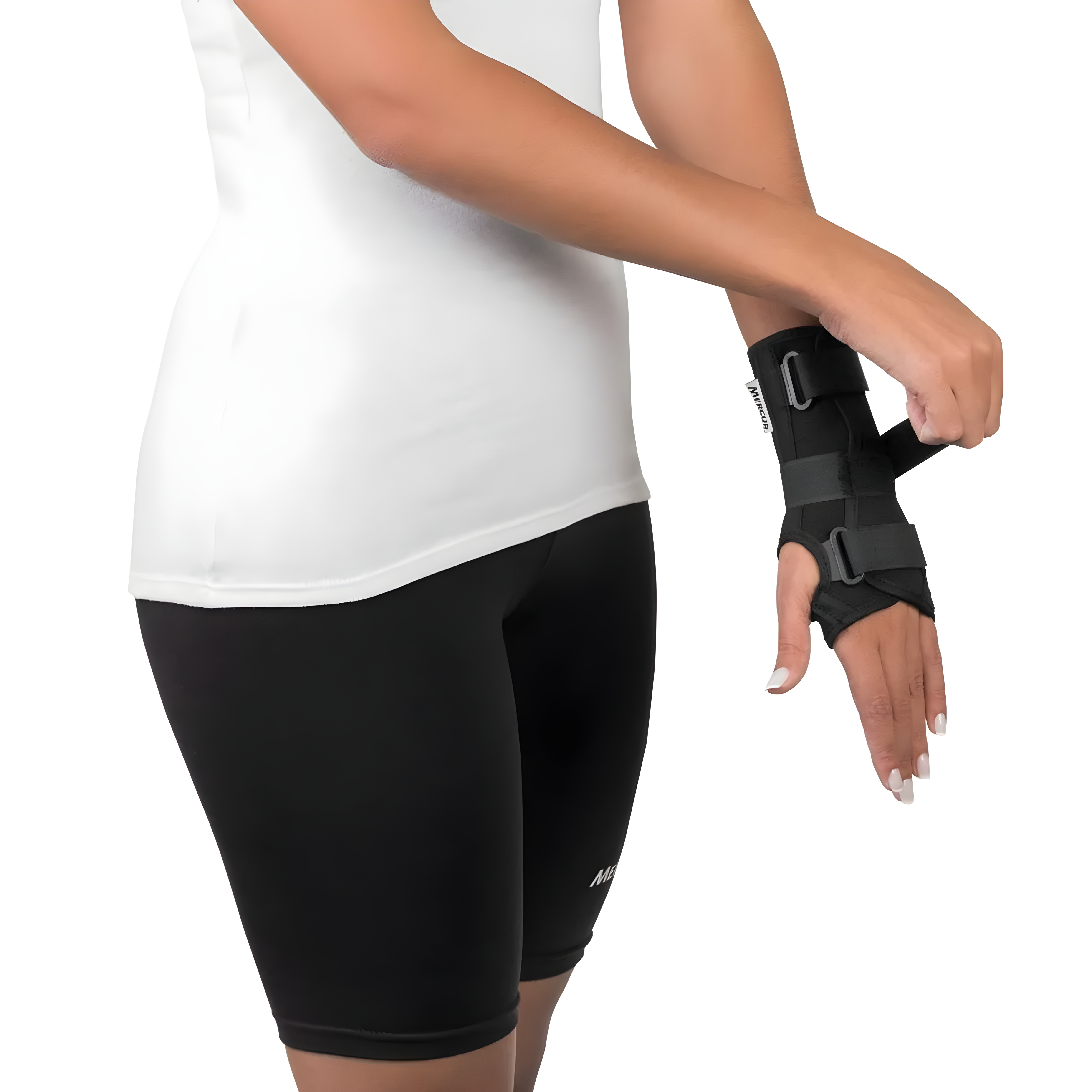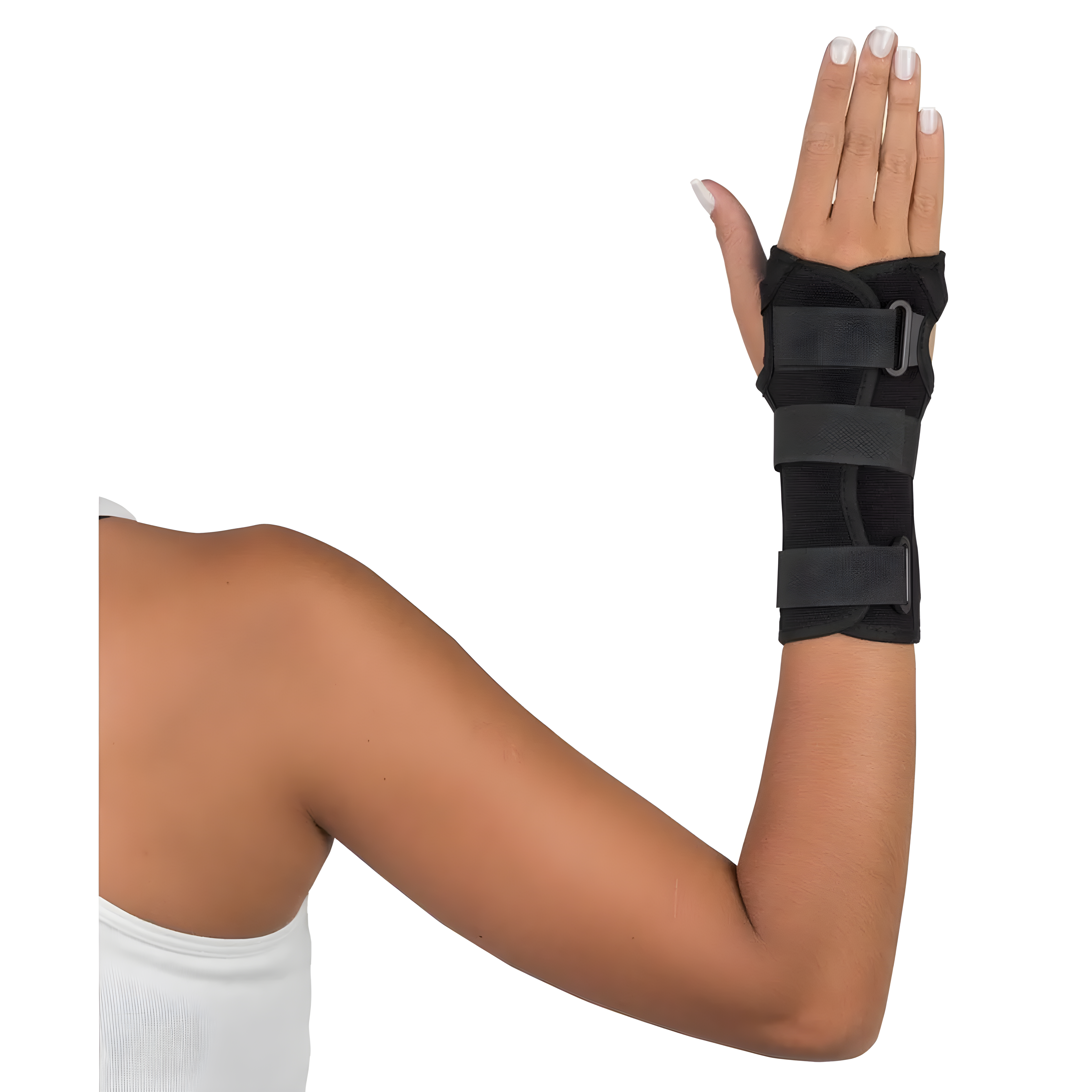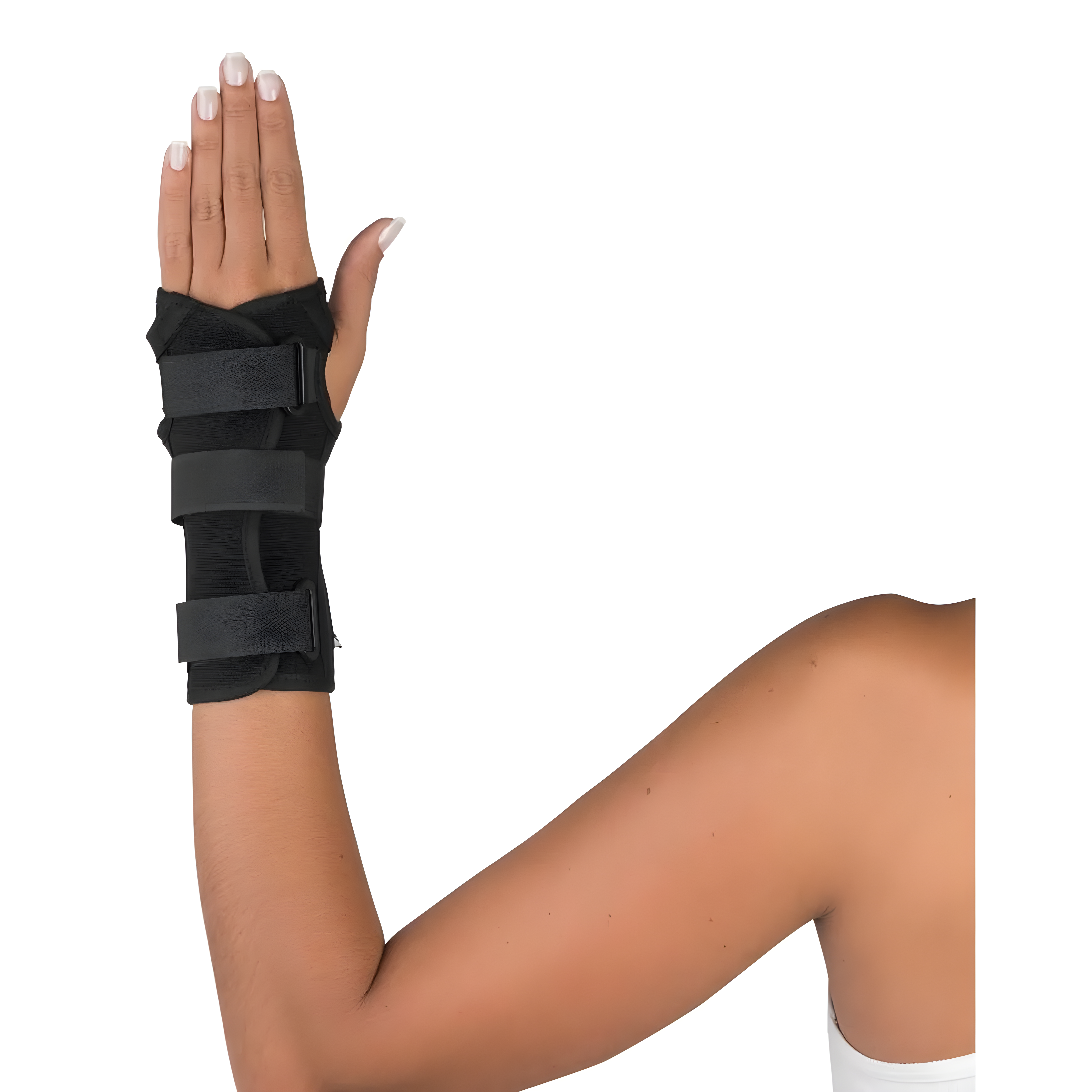 É uma órtese curta para estabilização do punho com tala rígida anatômica, que limita movimentos dolorosos e oferece suporte e conforto no dia a dia. O design bilateral permite uso em qualquer mão, com compressão regulável.